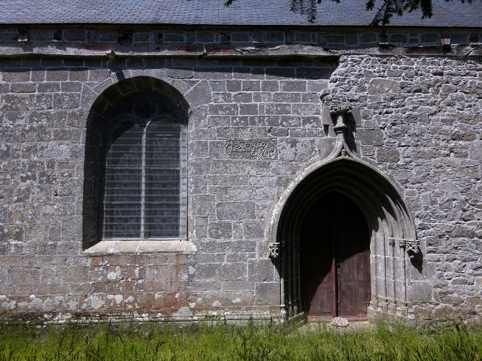 Ploubezre, Runfao : chapelle Saint-Fiacre, entrée sud et cartouche datant la restauration de l'année 1775Immatriculation