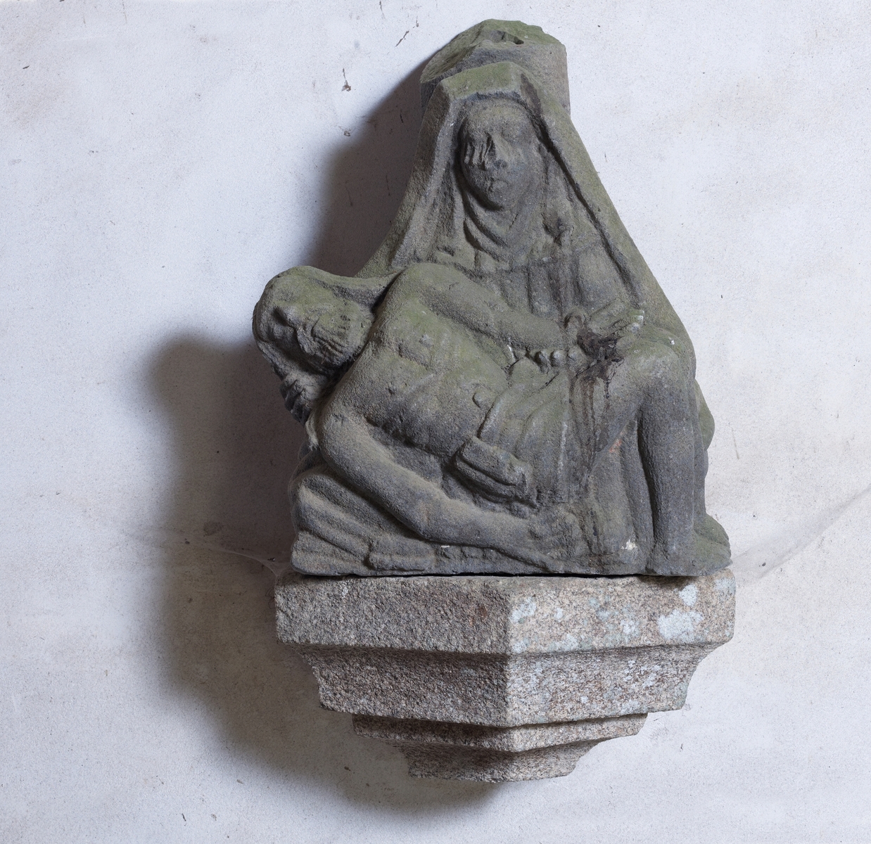Ploubezre, Runfao : chapelle Saint-Fiacre, Pietà ou Vierge de Pitié en kersanton (provenant d'une croix : ?)Immatriculation