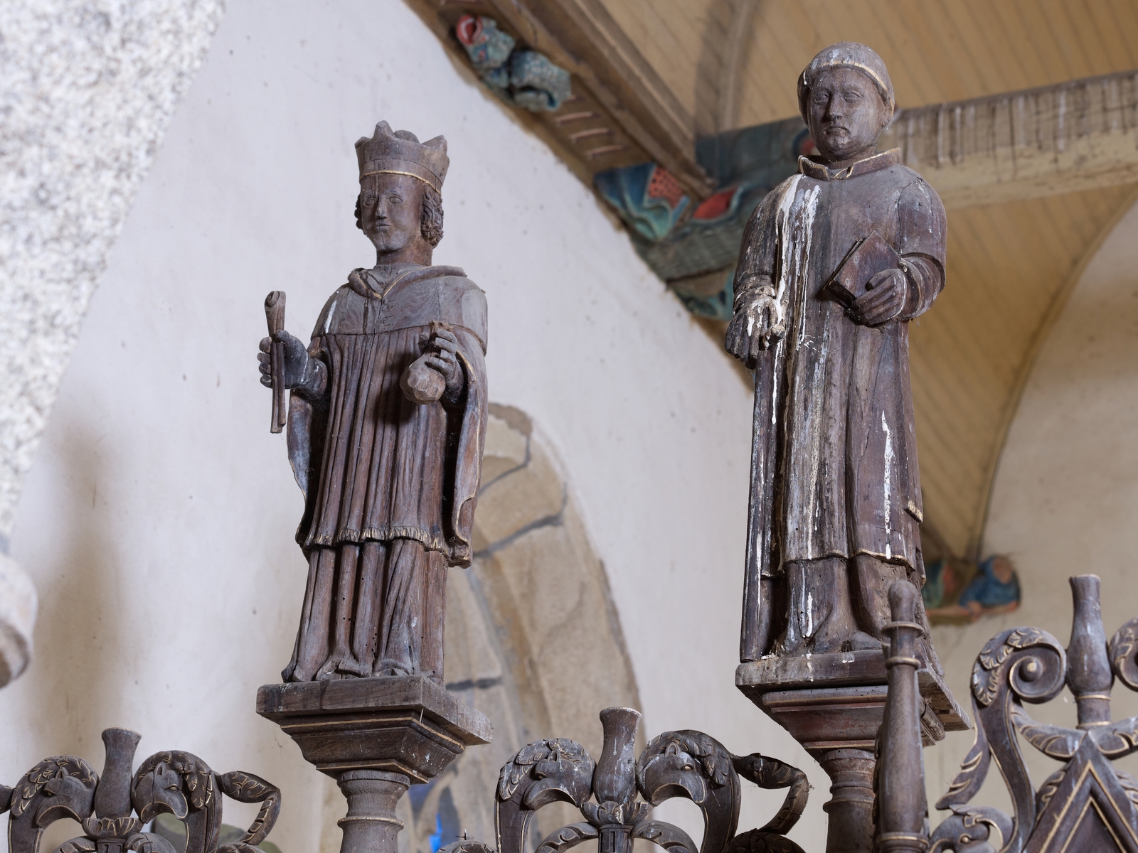 Ploubezre, Runfao : chapelle Saint-Fiacre, clôture en bois isolant la chapelle funéraire des châtelains de Kergrist, détail des statuesImmatriculation