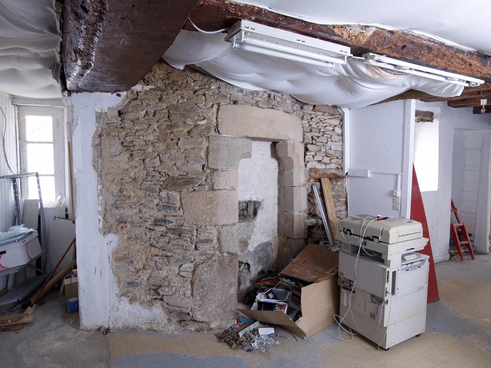 5 rue de l'église. Maison du 15e siècle. Détail de la tour d'escalier en demi hors-oeuvre accolée au mur gouttereau ouestImmatriculation