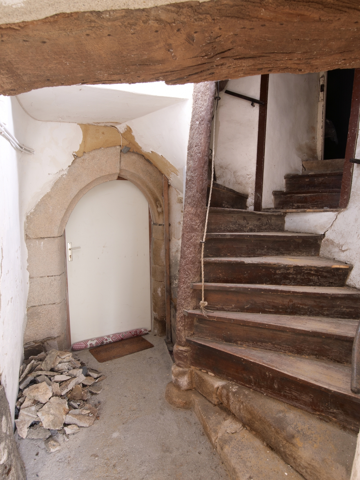 Tour d'escalier. Rez-de-chaussée : départ de l'escalier et porte d'accès donnant sur la pièce arrièreImmatriculation