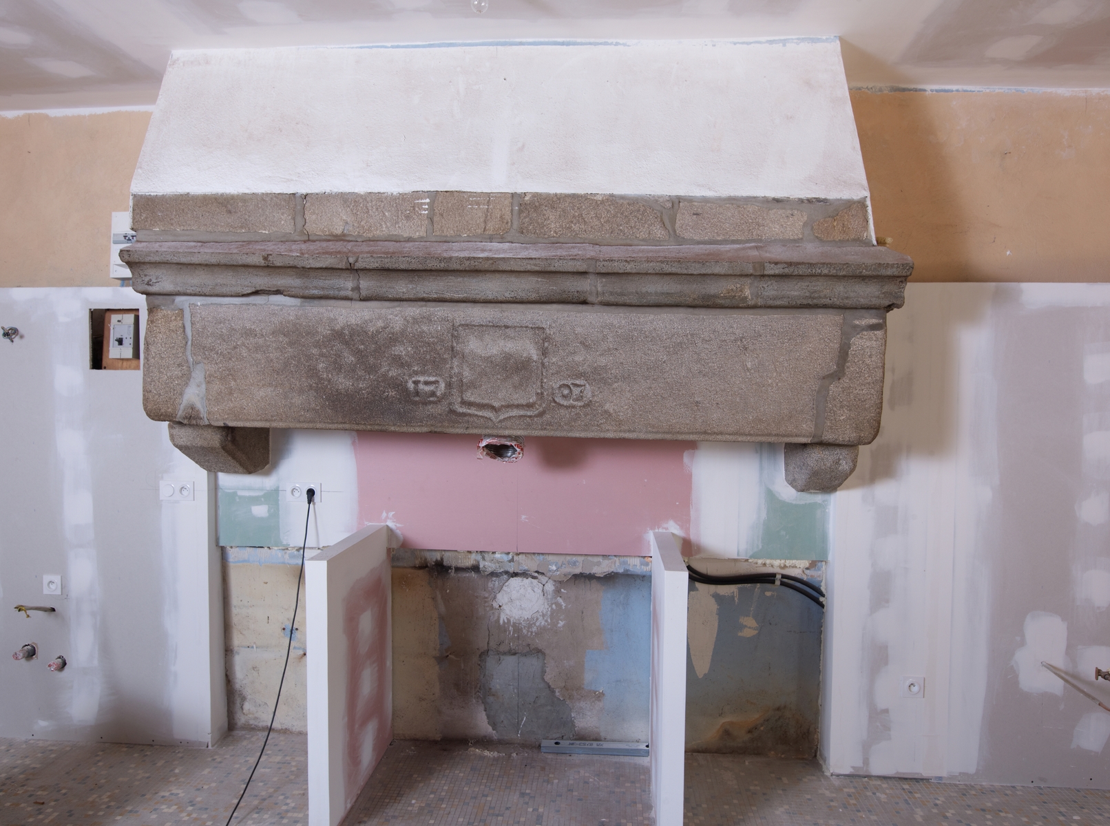 Ploubezre, Le Launay : manoir, rez-de-chaussée, extrémité sud, cheminée datée 1707. Les armoiries devaient être peintesImmatriculation
