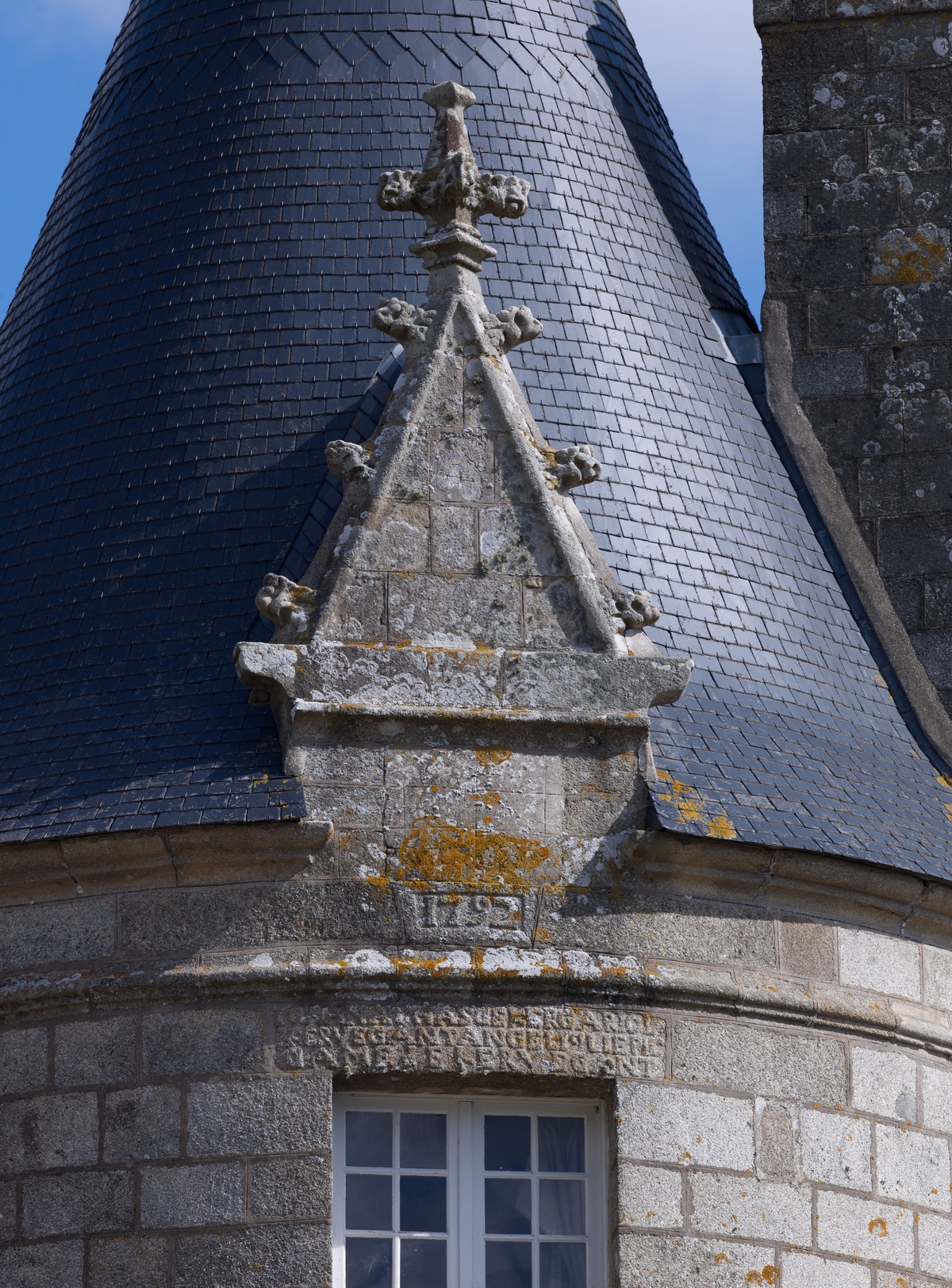 Ploubezre : château de Kergrist, vue depuis le sud, détail de la lucarne de la tour sud-est. Elle porte une inscription et le millésime 1792Immatriculation