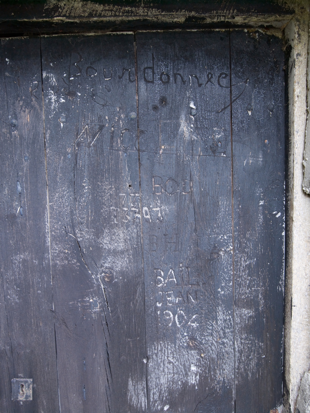 Etage de comble, détail de la porte en bois sur laquelle où l'on peut lire des patronymes et des comptesImmatriculation