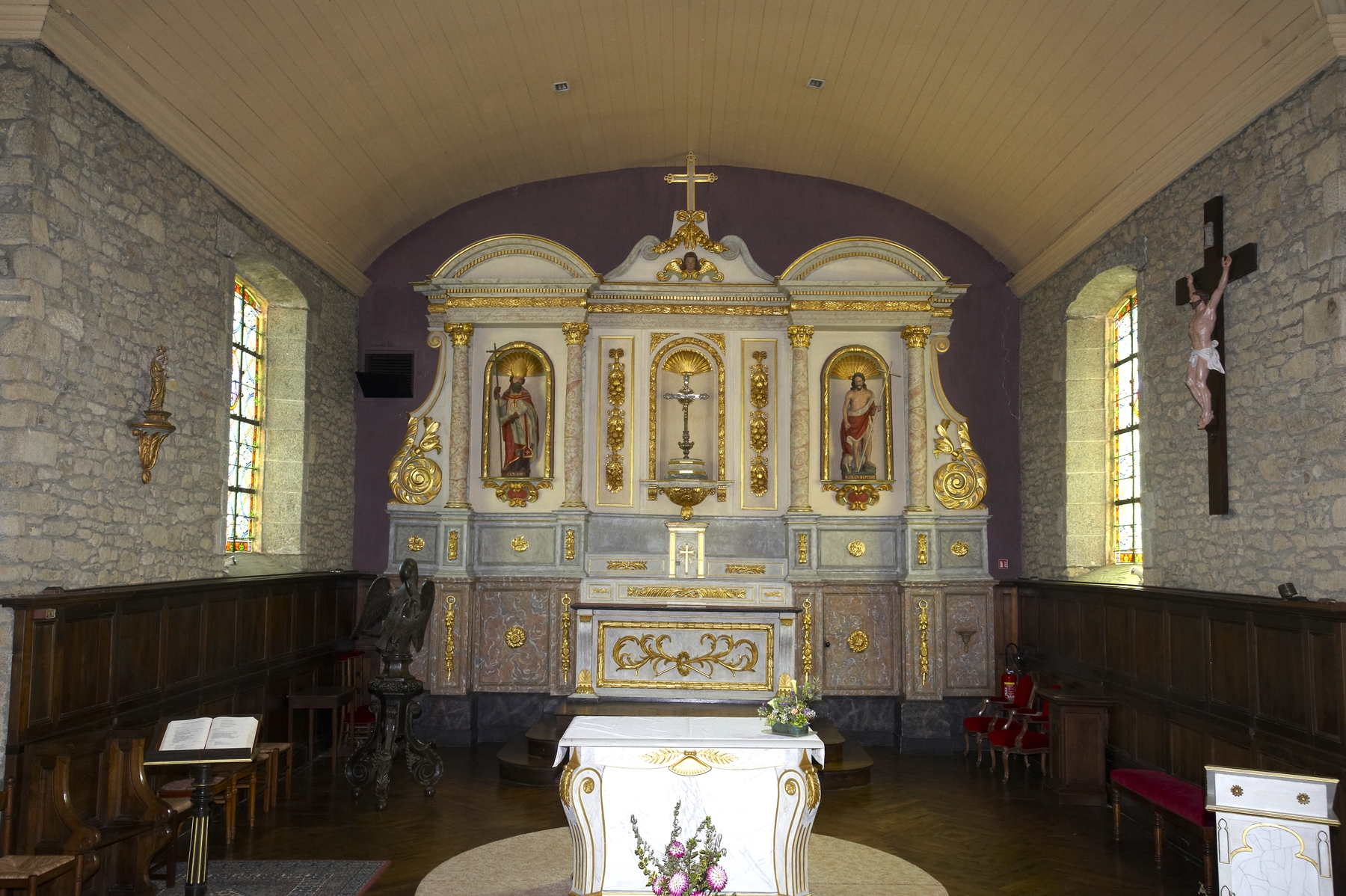 Le retable en bois sculpté polychrome, vue de la nefImmatriculation