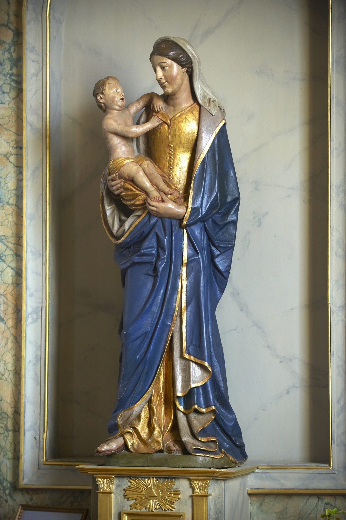 Statue en bois polychrome de la Vierge à l'Enfant, vue de la nef.Immatriculation