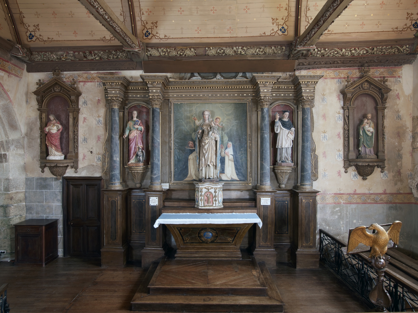 Trémel, le bourg : église paroissiale Notre-Dame, vue intérieure, transept sud formant chapelle, retable de la Vierge et de l'enfant Jésus ; au centre : Notre-Dame-de-la-Merci, de part et d'autre : saint Yves (à droite) et saint Jean apôtre. A droite de l'autel : saint Joseph, à gauche : Jésus Christ (dévotion du sacré coeur). Au premier plan à droite : lutrin datable du 18e siècleImmatriculation