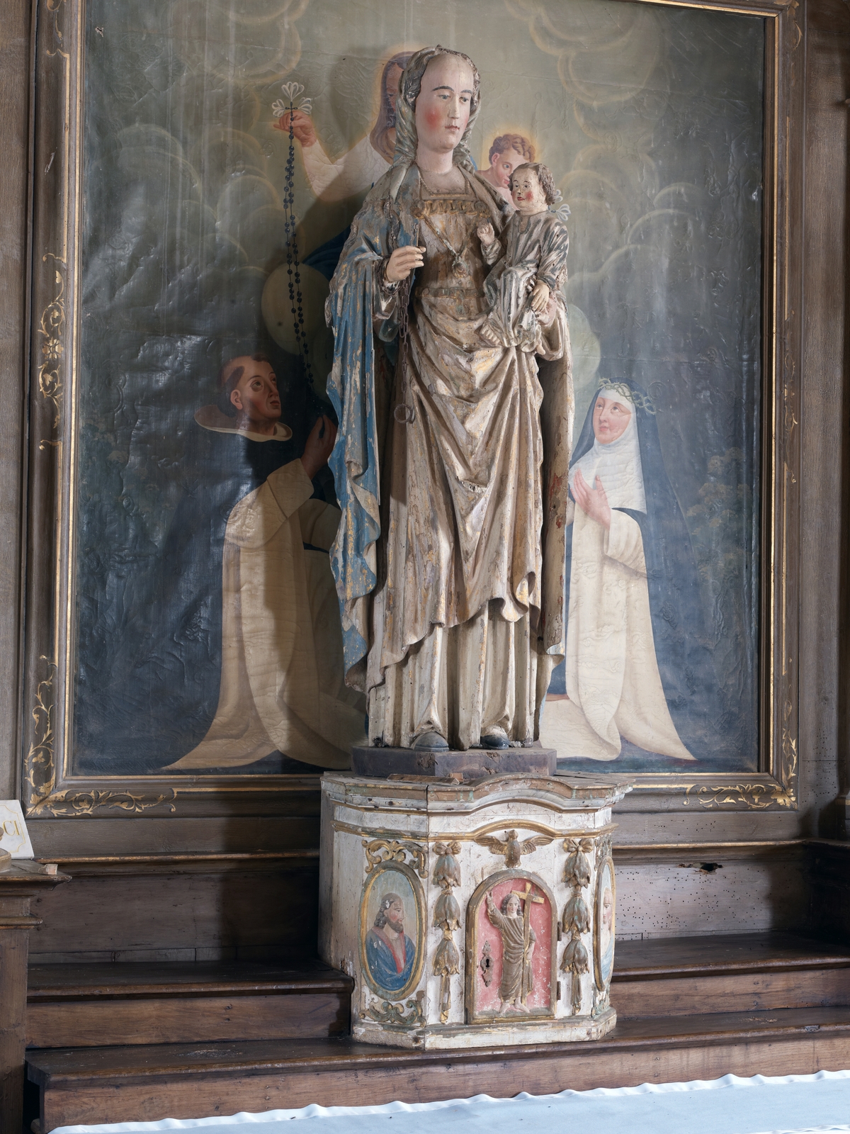 Trémel, le bourg : église paroissiale Notre-Dame, vue intérieure, transept sud formant chapelle, retable de la Vierge et de l'enfant Jésus ; au centre : Notre-Dame-de-la-MerciImmatriculation