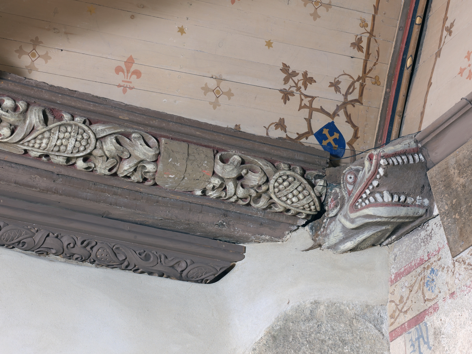 Trémel, le bourg : église paroissiale Notre-Dame, vue intérieure, transept sud formant chapelle, détail de la sablière et d'un engoulantImmatriculation