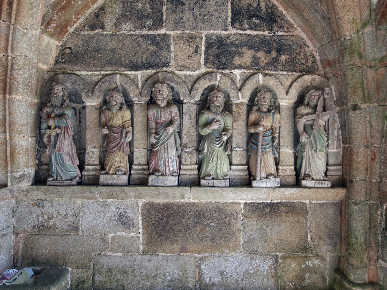 Trémel, le bourg : église paroissiale Notre-Dame, porche sud, 6 des 12 statues des apôtresImmatriculation