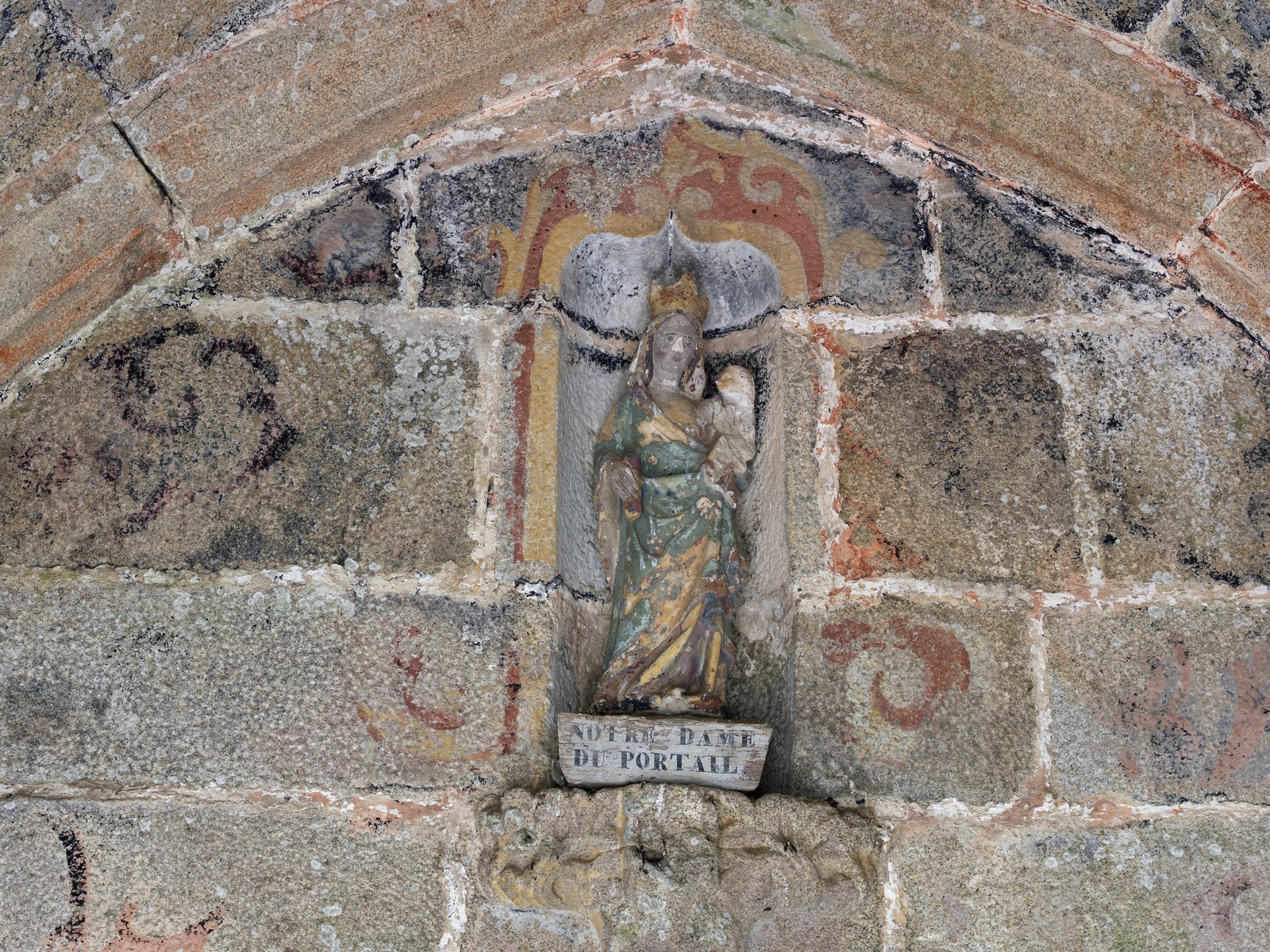 Trémel, le bourg : église paroissiale Notre-Dame, porche sud, statue de Notre-Dame du PortailImmatriculation
