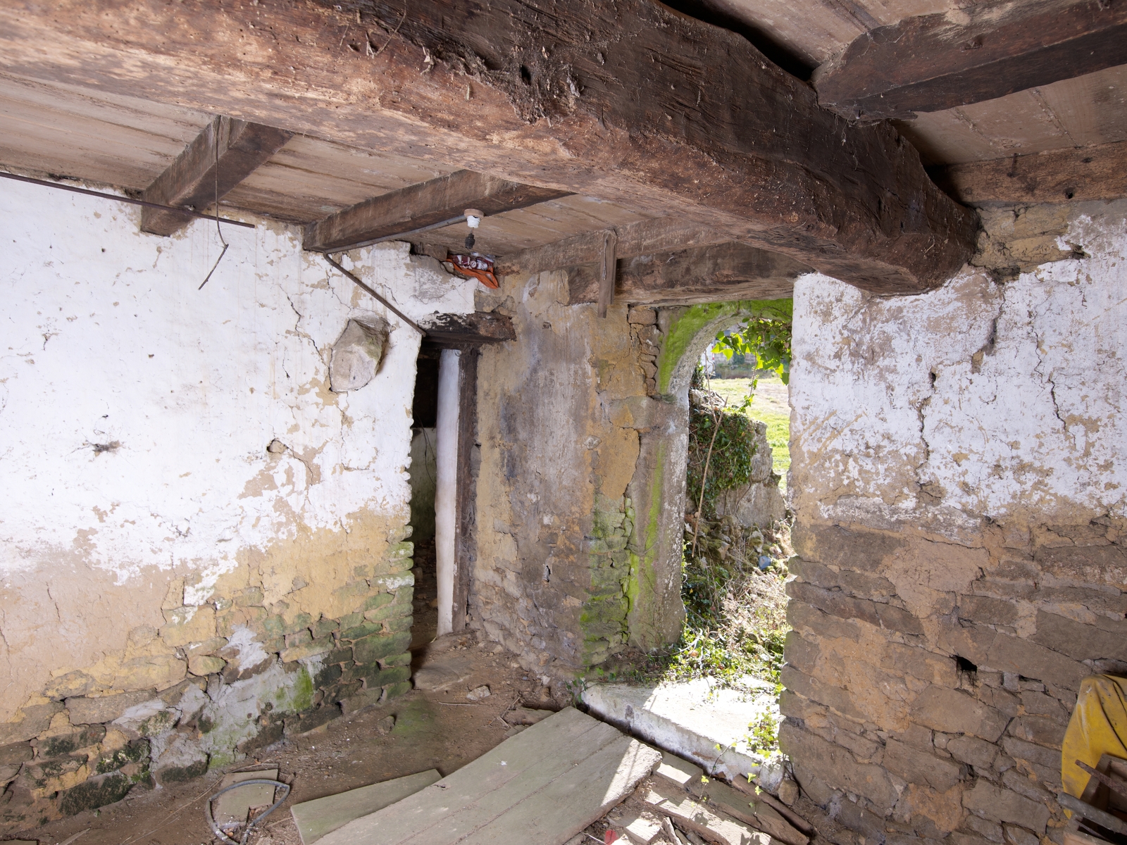 Trémel, Louc'h : ferme de type à avancée centrale, vue intérieure, étable située à l'extrémité nord. Porte percée dans le mur de refendImmatriculation