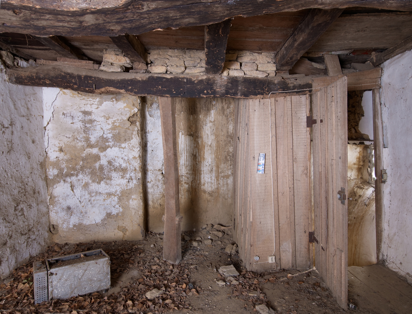 Trémel, Louc'h : ferme de type à avancée centrale, vue intérieure, étage, cheminée du pignon sud et cloison isolant l'escalierImmatriculation