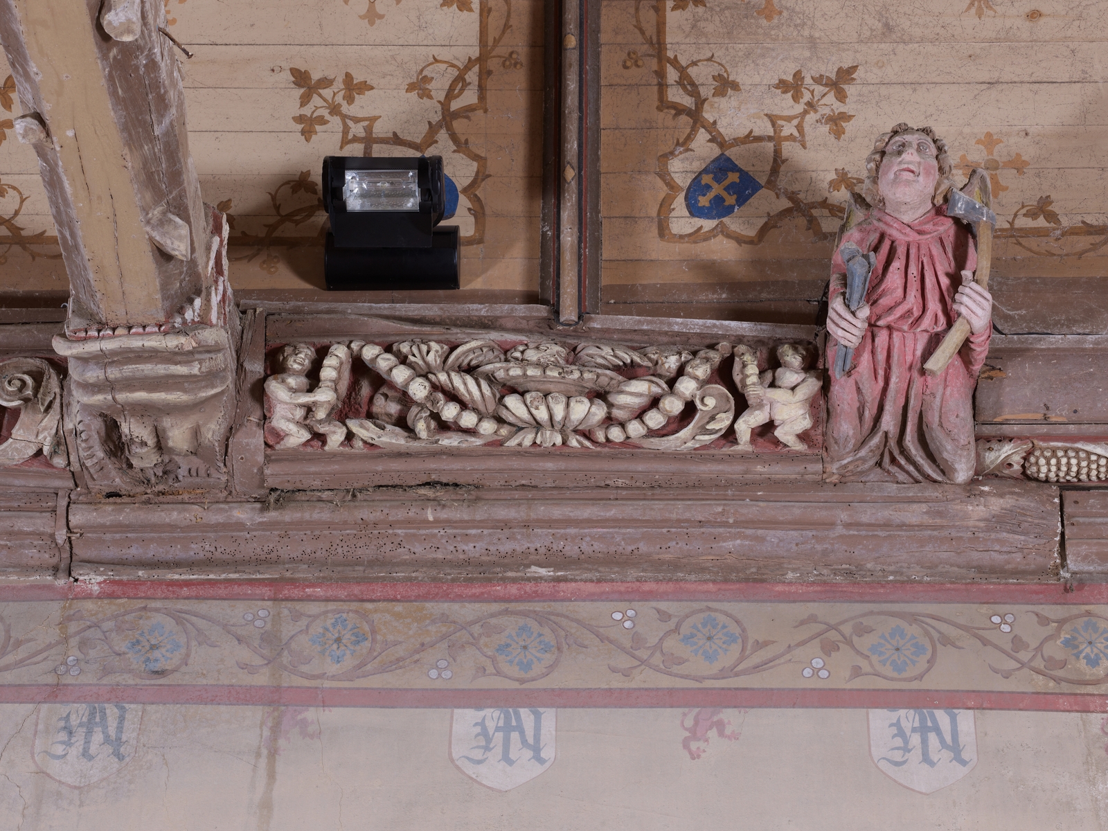Trémel : église paroissiale Notre-Dame, vue intérieure, sablière, engoulant et blochet sculptésImmatriculation