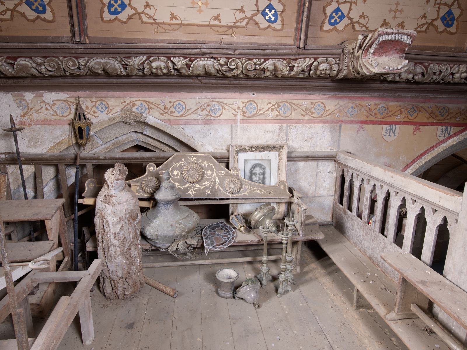 Trémel : église paroissiale Notre-Dame, vue intérieure, objets conservés dans la tribuneImmatriculation