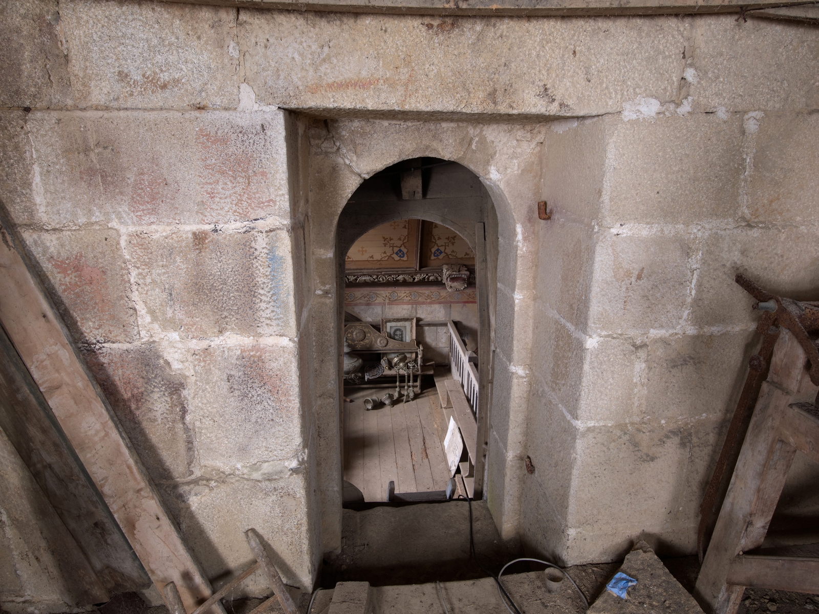 Trémel : église paroissiale Notre-Dame, vue intérieure, accès à la pièce située au-dessus du porche sudImmatriculation