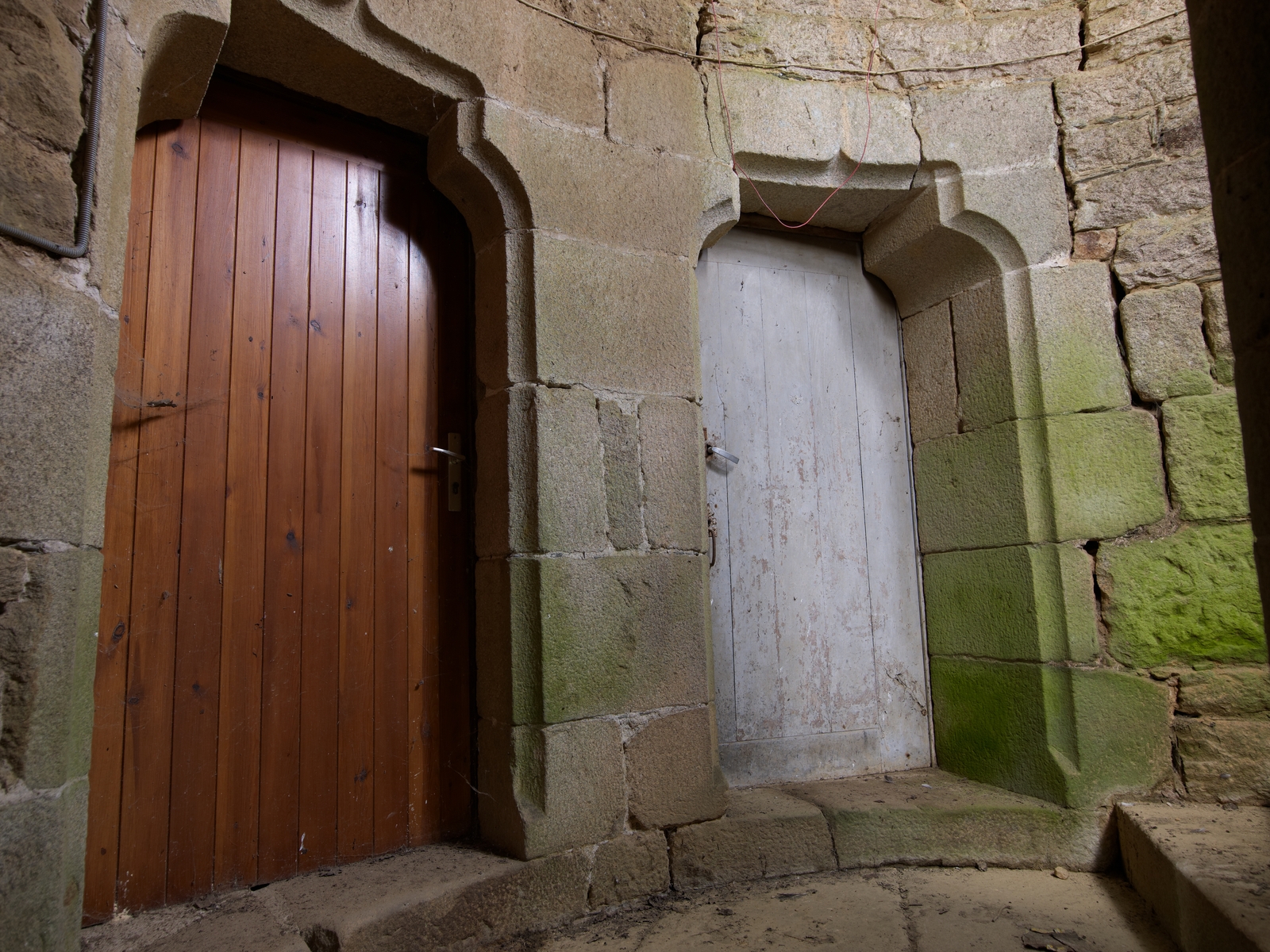 Trémel : manoir de Kermerzit, vue intérieure, logis est, escalier en vis, palier de l'étage, portes à linteau sur corbelet chanfreiné et surmonté d'une accoladeImmatriculation