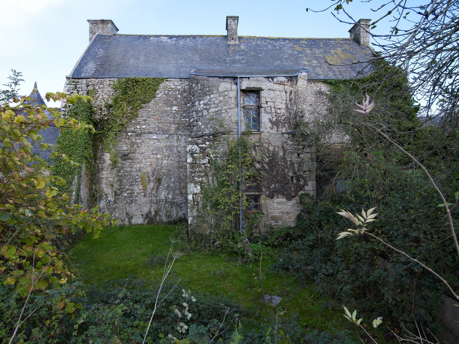 Trémel : manoir haut de Kermerzit, élévation postérieure orientée vers le sud. La partie supérieure de la tour d'escalier a été araséeImmatriculation