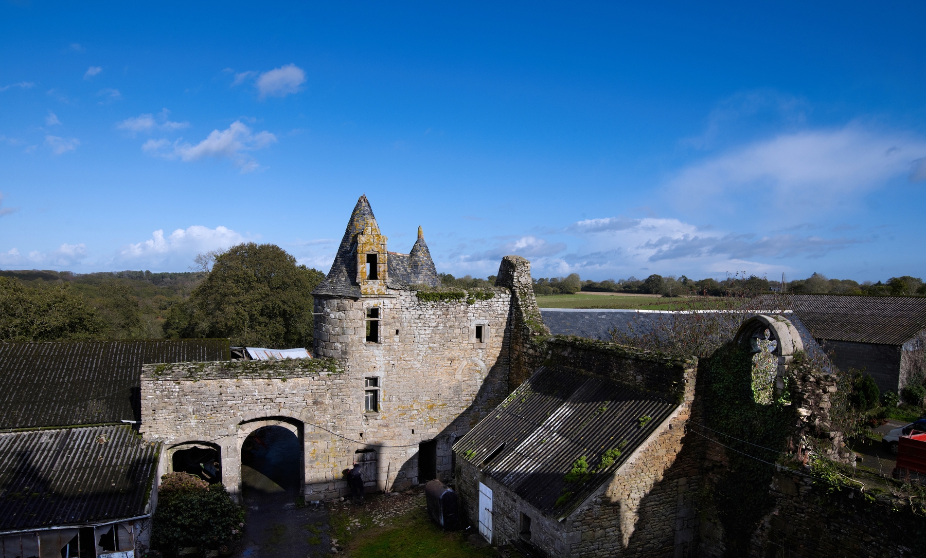 Trémel : manoir de Kermerzit, revers des portes piétonne et cochère et tour autrefois desservie par une galerie. Il est probable que cette tour ait pu servir de logement à un chapelain affecté à l'office de la chapelle seigneurialeImmatriculation
