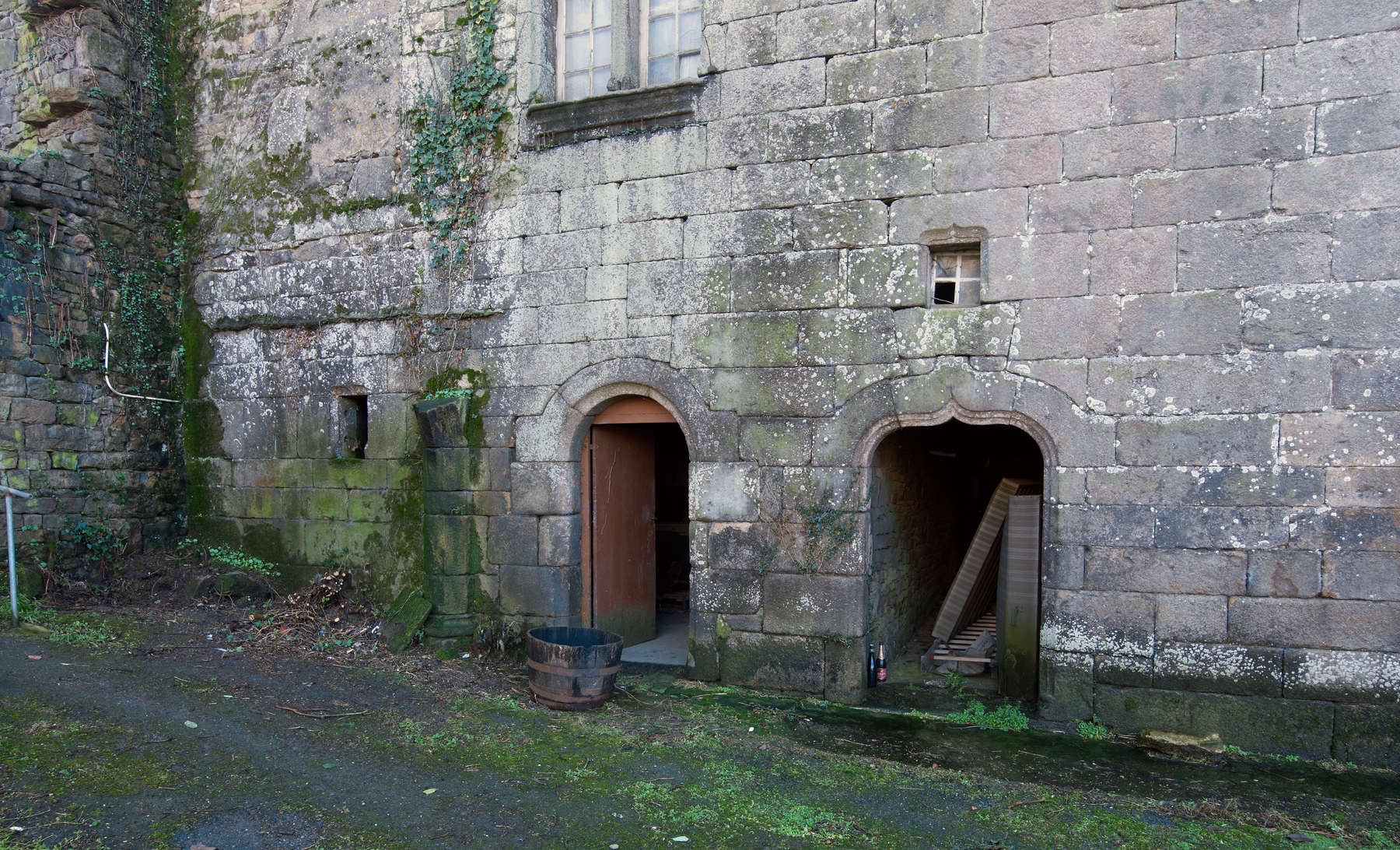 Trémel : manoir haut de Kermerzit, élévation antérieure orientée vers le nord, portes menant au cellier (à l'est) et au couloir traversant desservant l'escalier à visImmatriculation