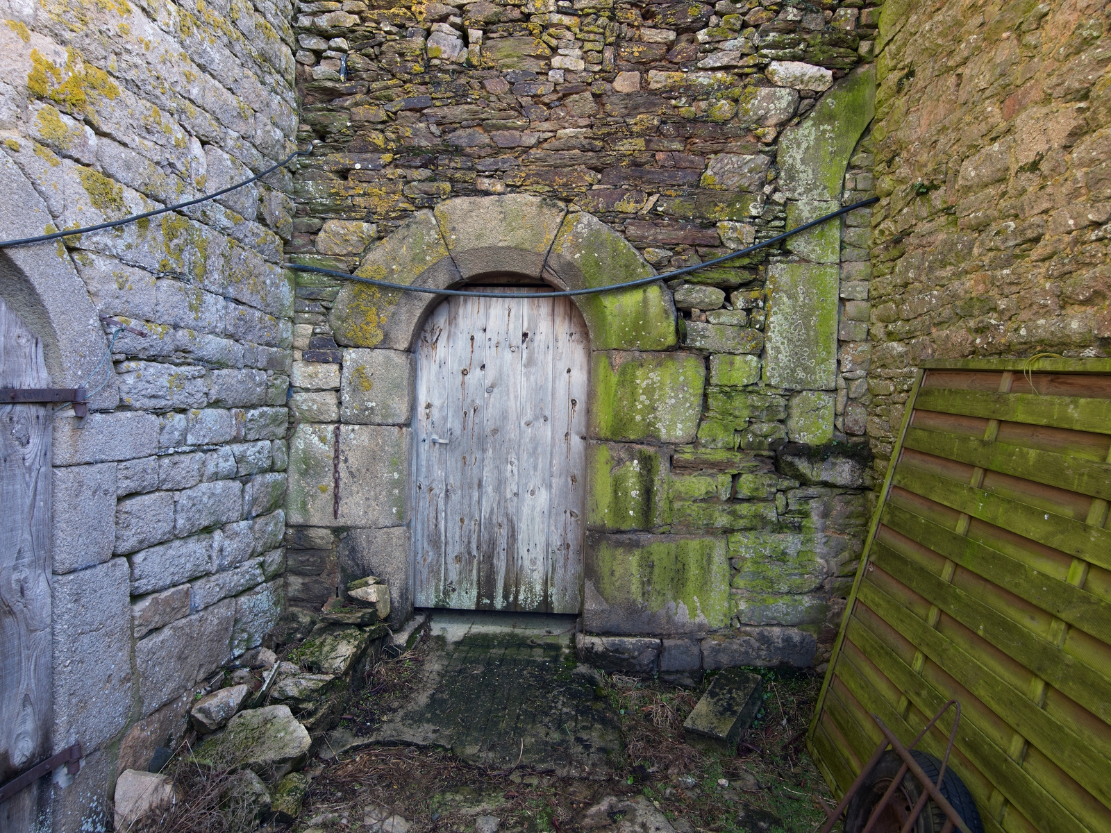 Trémel : manoir de Kermerzit, porte menant de la cour basse (manoirs) au rez-de-chaussée de la métairie (cour haute). Une seconde porte (murée) permettait d'accéder à la cour hauteImmatriculation