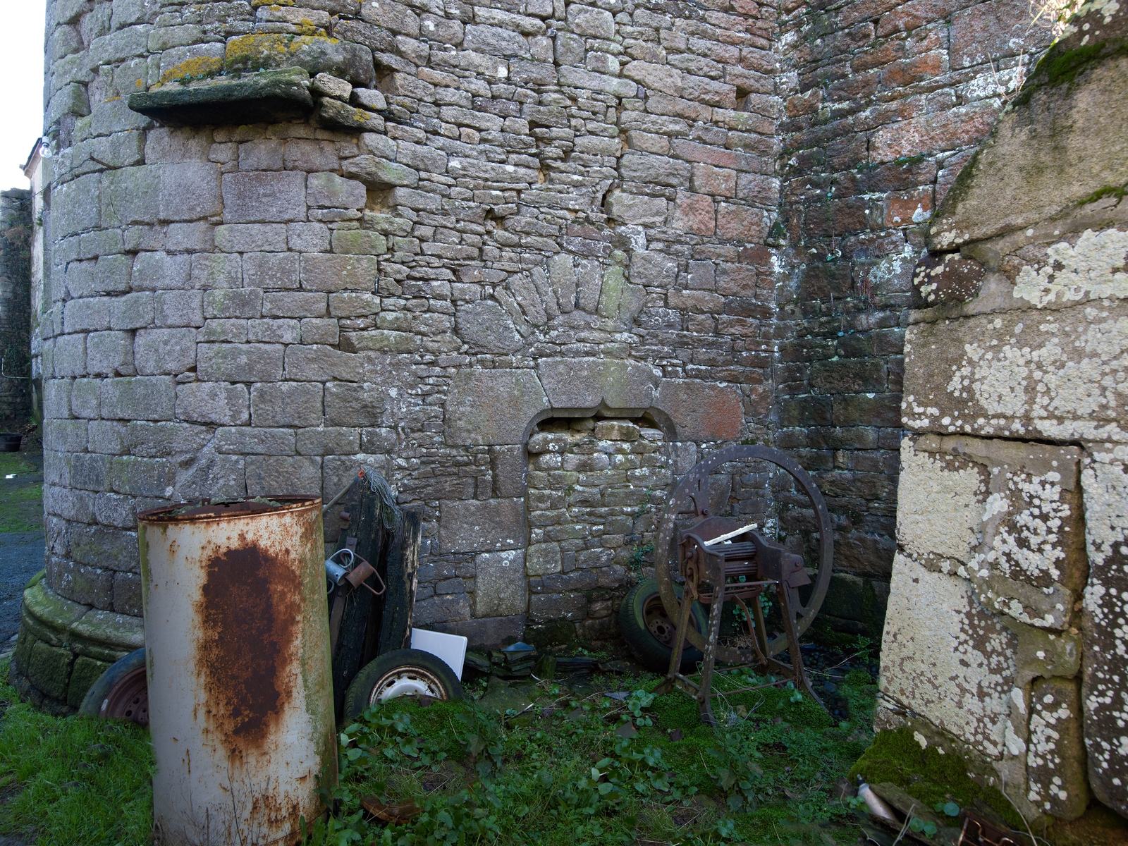 Trémel : manoir bas de Kermerzit, porte murée de la tour. Elle est surmontée d'un linteau en accolade lui-même surmonté d'un petit arc de déchargeImmatriculation