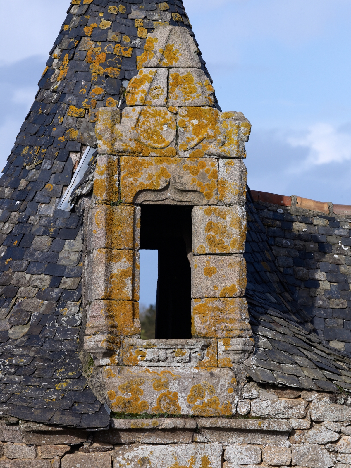 Trémel : manoir de Kermerzit, détail de la lucarne de la tour. Il est probable que cette tour ait pu servir de logement à un chapelain affecté à l'office de la chapelle seigneurialeImmatriculation