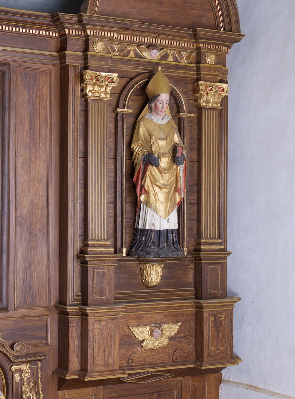 Plufur, le bourg : église paroissiale Saint-Florent, transept sud, vue de détail du retableImmatriculation