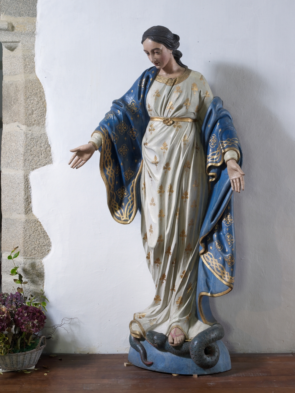 Plufur, le bourg : église paroissiale Saint-Florent, statue représentant la Vierge écrasant un serpentImmatriculation