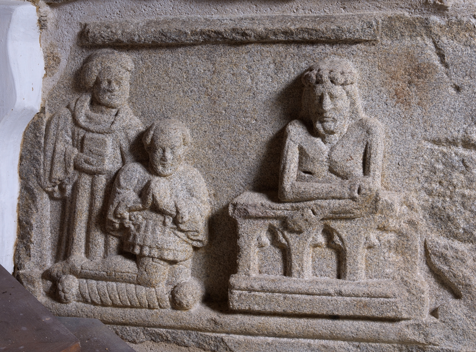 Plufur, le bourg : église paroissiale Saint-Florent, retable en granite - à l'origine situé en arrière de la table d'autel. Ici, la Résurrection : le Christ, couronné d'épines, apparaît de face, sortant d'un sarcophageImmatriculation
