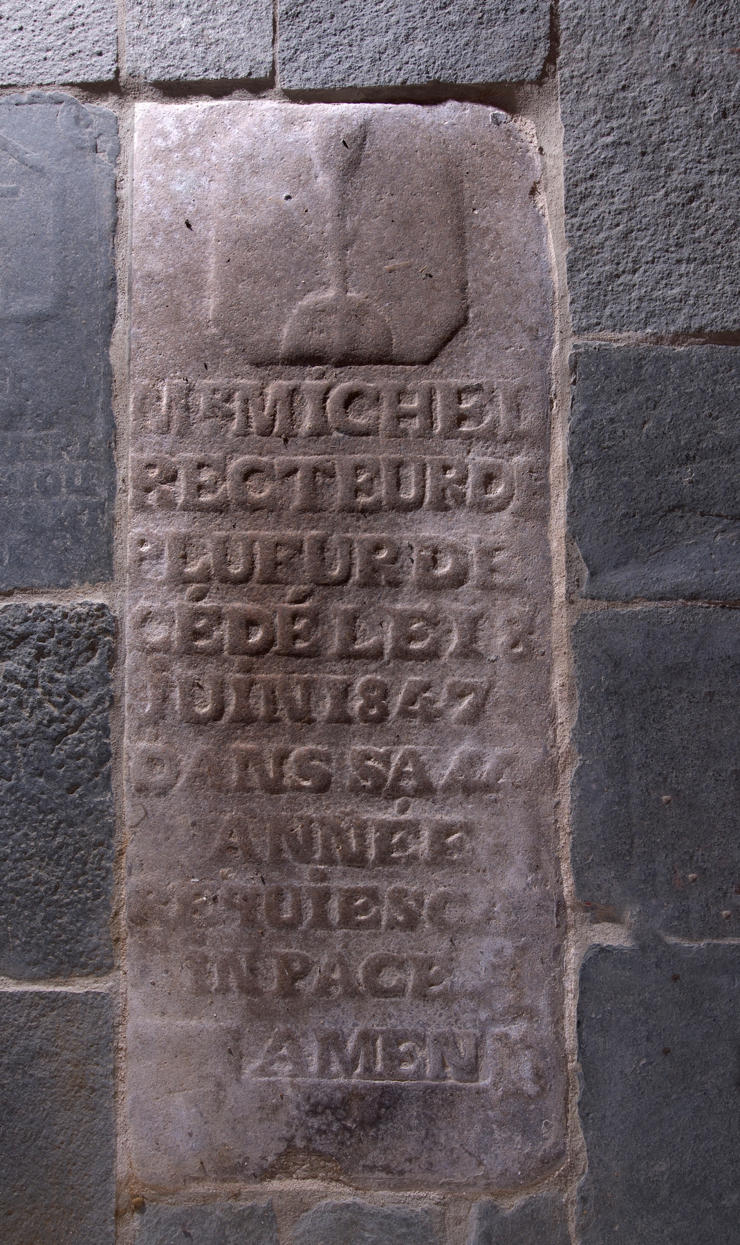 Plufur, le bourg : église paroissiale Saint-Florent, ancienne pierre tombale. On peut lire l'inscription suivante : "M[onseigneu]R MICHEL / RECTEUR DE / PLUFUR DE/CEDE LE 18 / JUIN 1847 / DANS SA _ ANNEE / REQUIESCAT / IN PACE / AMEN"Immatriculation
