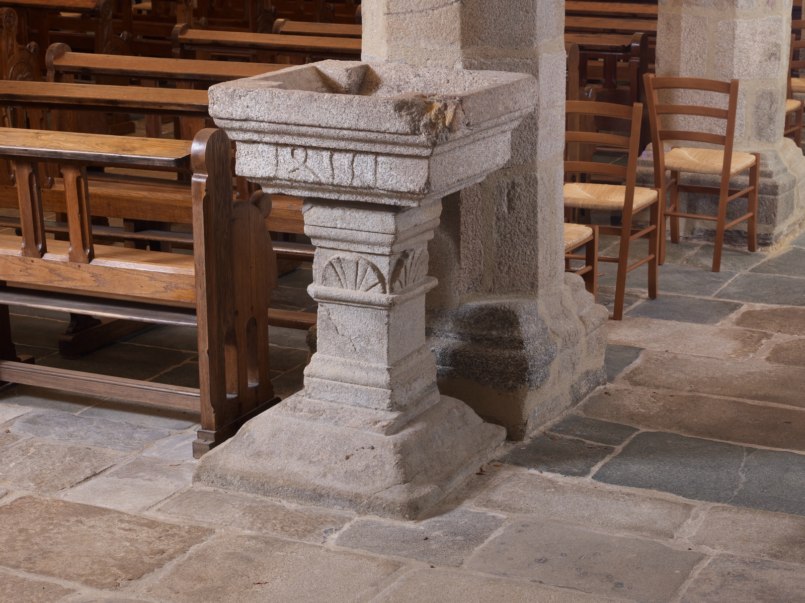 Plufur, le bourg : église paroissiale Saint-Florent, bénitier. On peut lire la date de 1558 (date inversée)Immatriculation