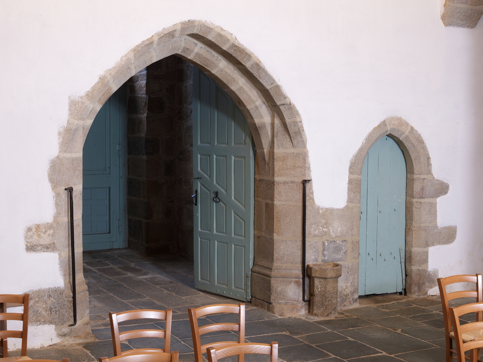 Plufur, le bourg : église paroissiale Saint-Florent, porte ouest et porte de l'escalier en vis menant au clocherImmatriculation