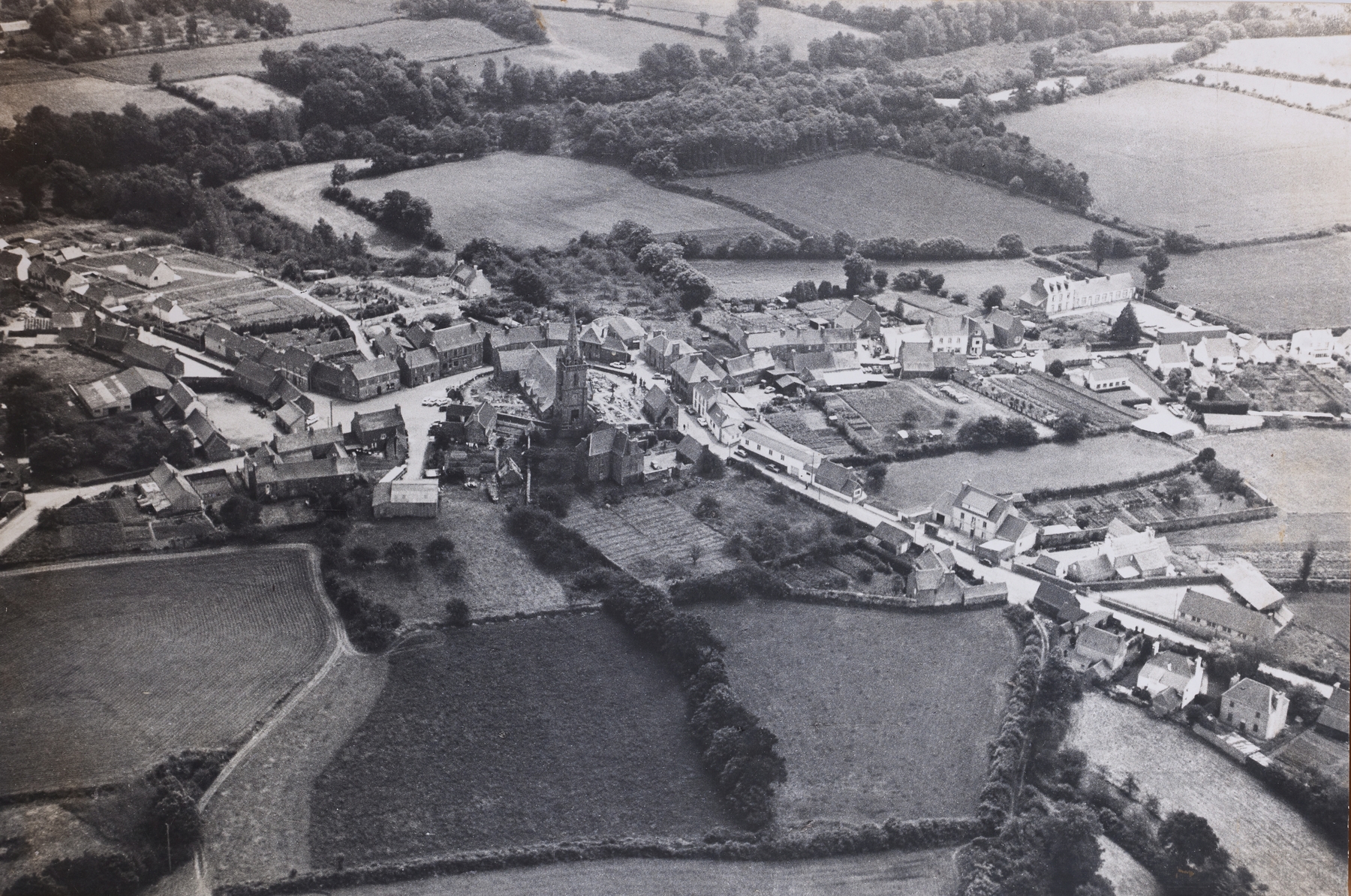 Plufur : le bourg et l'église paroissiale Saint-Florent, vue aérienne oblique depuis l'ouest-nord-ouest, vers 1972-1973 (collection : Mairie de Plufur)Immatriculation