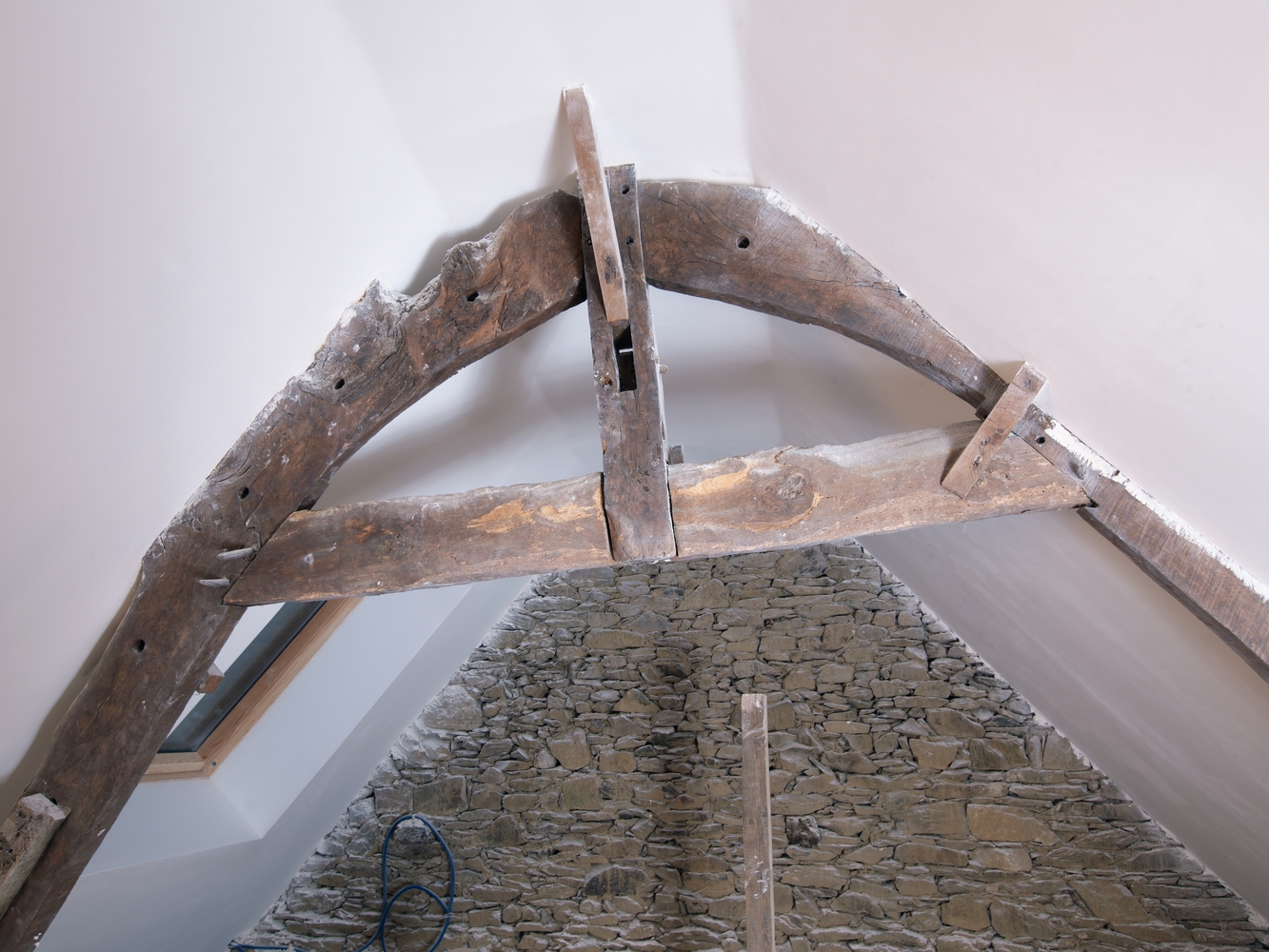 28 rue de la fontaine. Ancienne maison à pans de bois, 15e siècle-16e siècle, remaniée au 19e siècle. Détail de la charpente à poinçon courtImmatriculation
