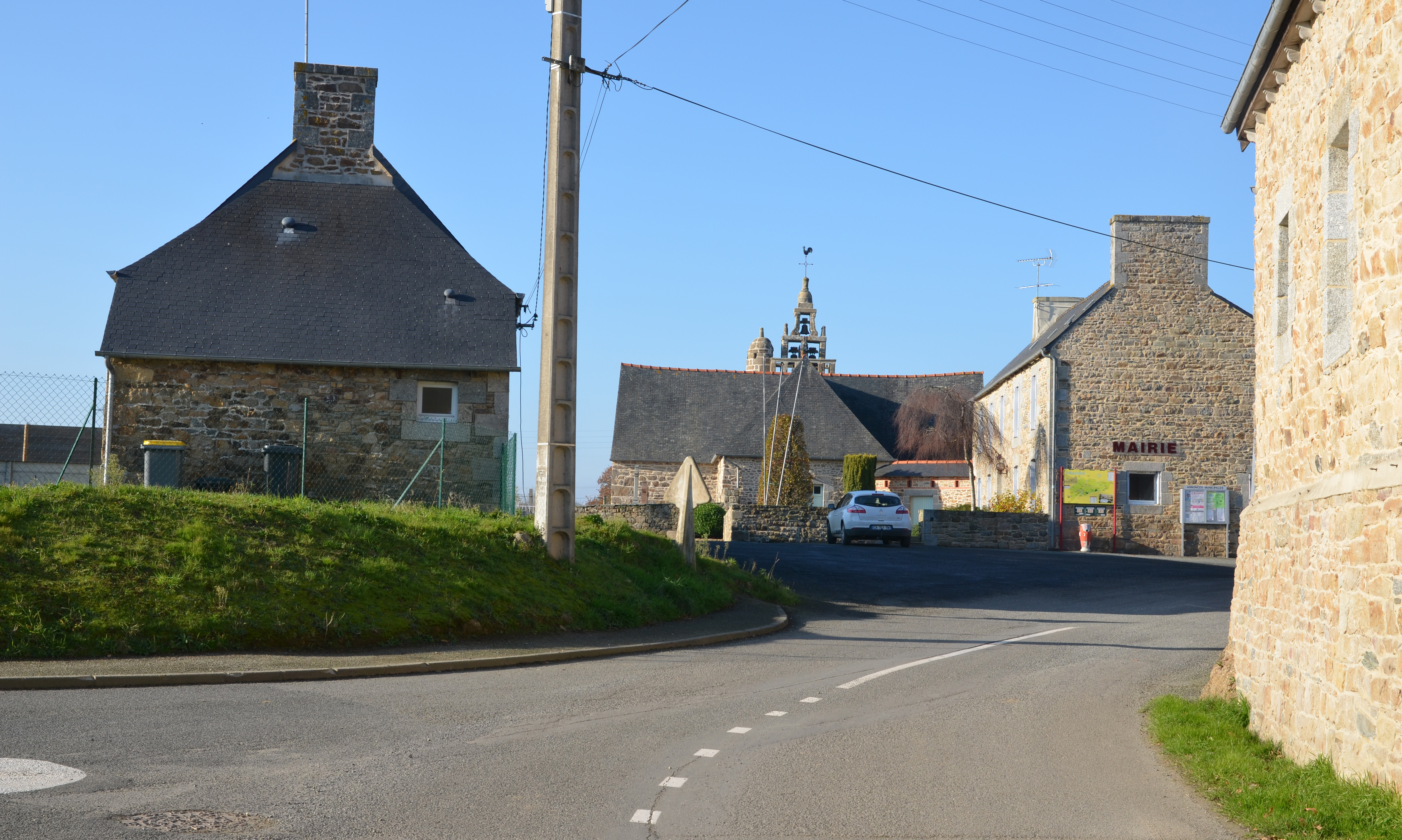 Mantallot, le bourg : voirie, maisons, presbytère aujourd'hui mairie et église paroissiale Saint Médéric, vue générale depuis l'estImmatriculation