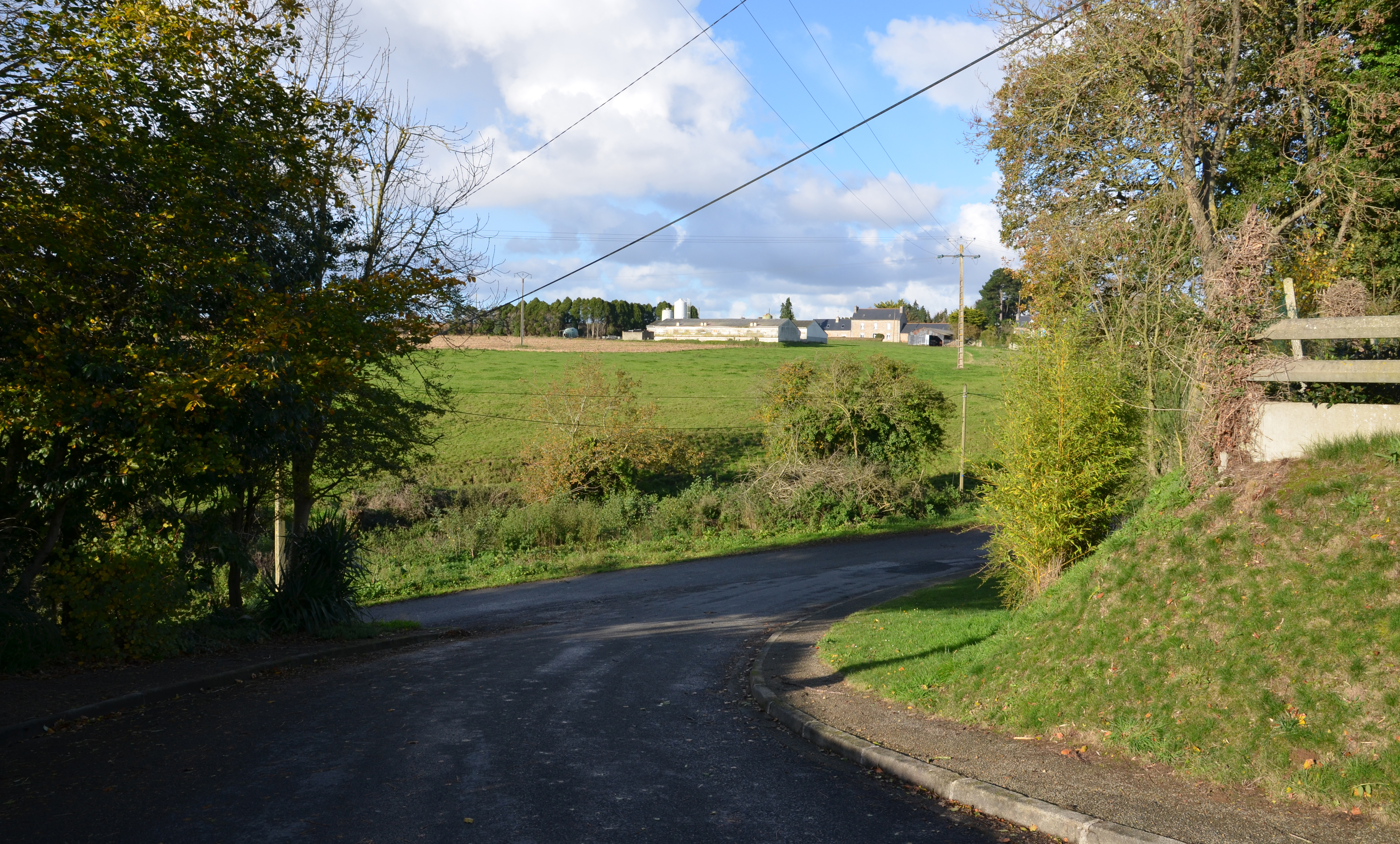 Mantallot, le bourg (sud), Cité Saint-Mérin : entrée ouest. En arrière-plan : bâtiments d'élevage hors-sol et ancienne ferme de Penn ar GuerImmatriculation