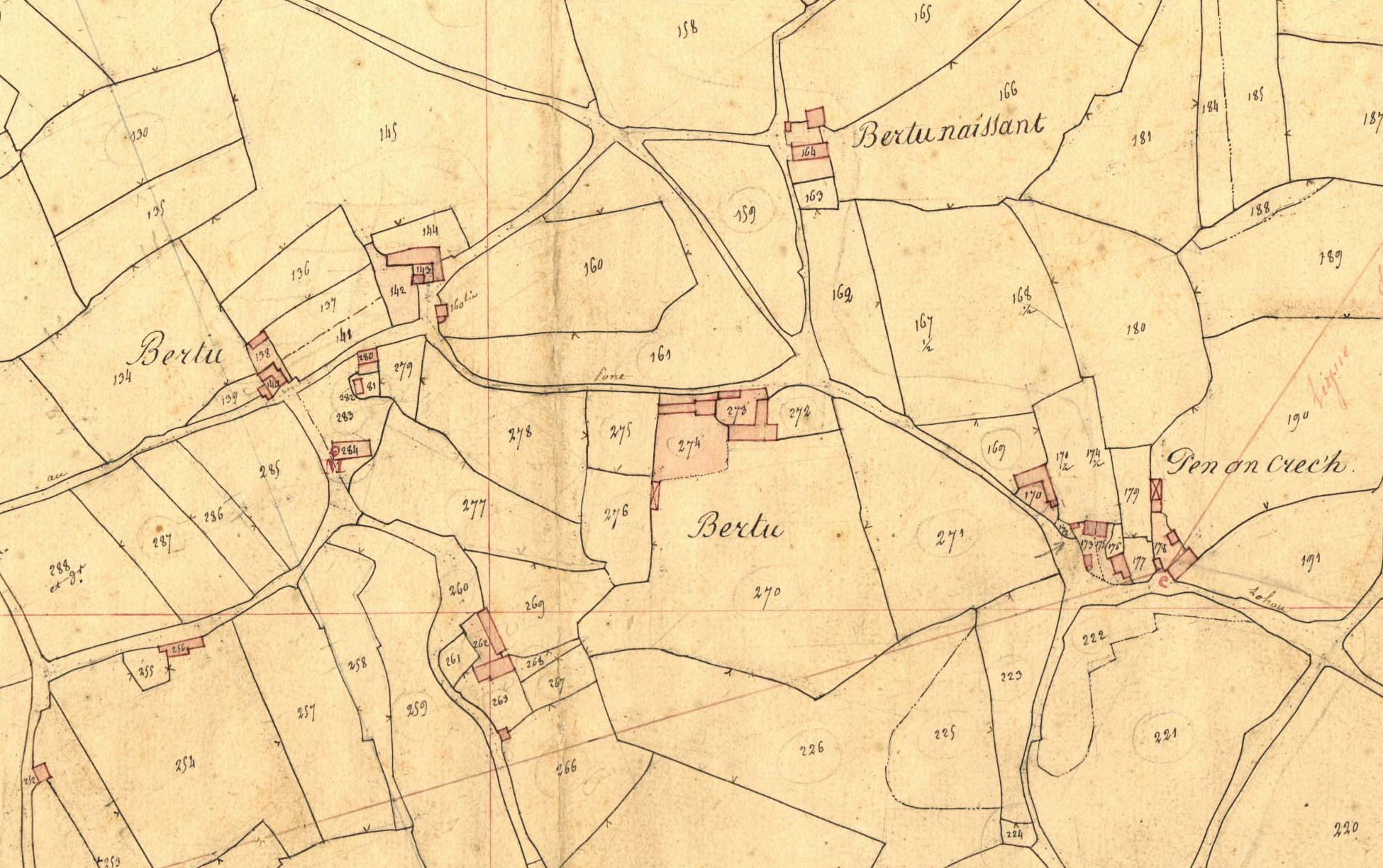 Extrait du cadastre ancien de la commune de Mantallot, 1835 : Bertu, Bertu naissant et Pen an Crec'hImmatriculation
