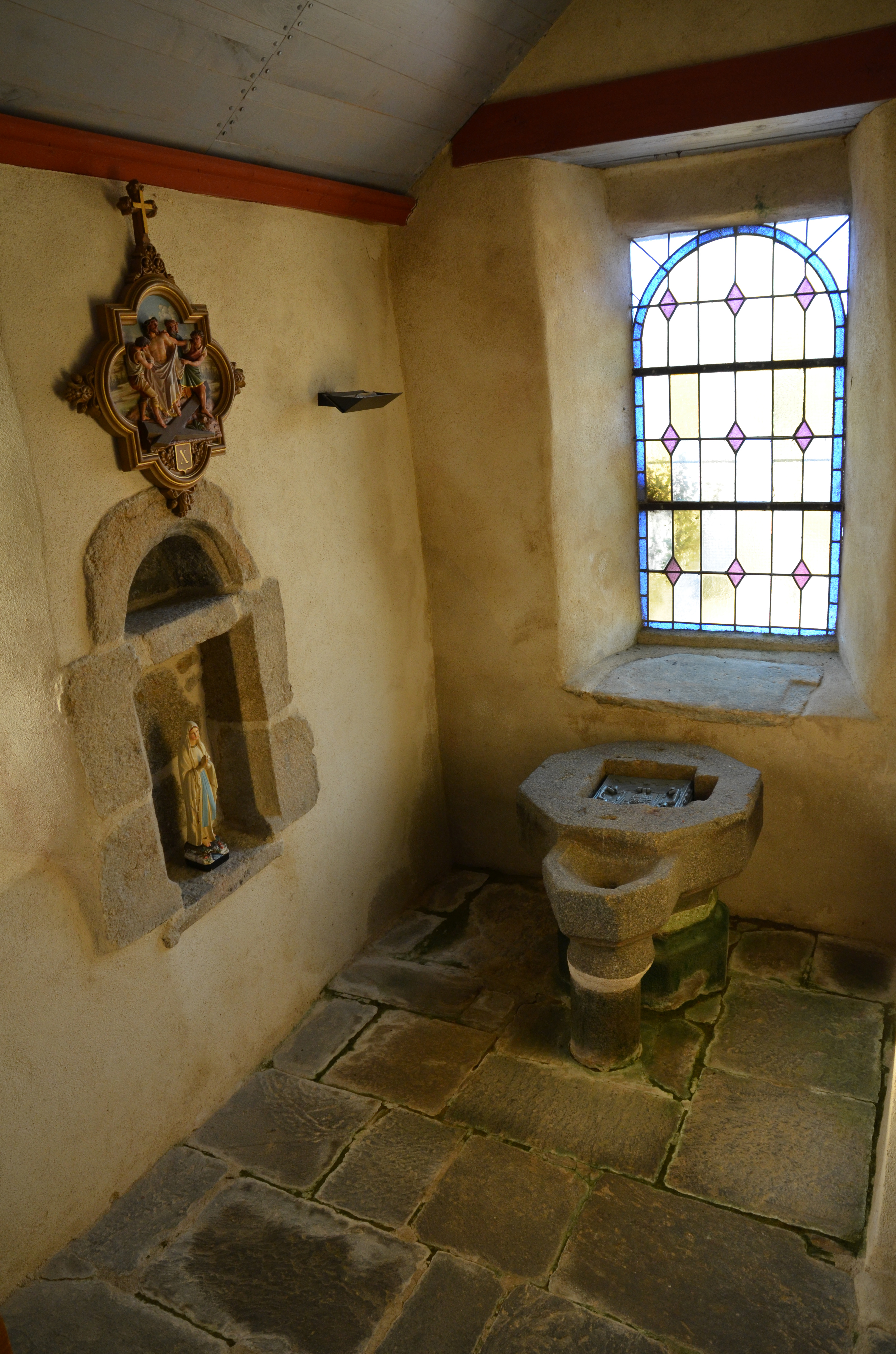 Mantallot, le bourg : église paroissiale Saint Médéric, vue intérieure, fonts baptismaux et crédenceImmatriculation