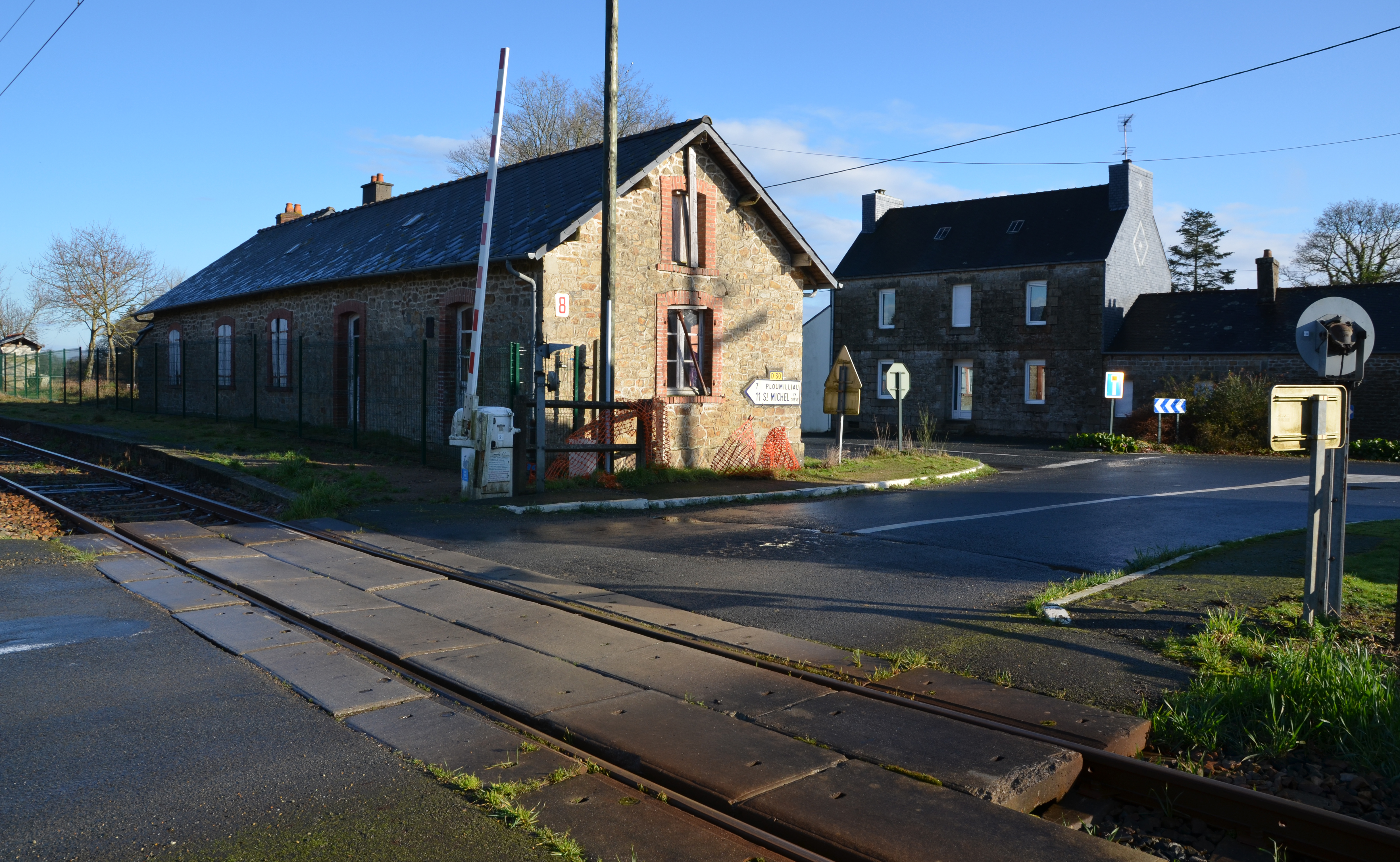 Ploubezre, Kerauzern : ancienne gare (maison de garde-barrières et bâtiment voyageur). A l'arrière plan : ancien magasin de commerce aujourd'hui maisonImmatriculation