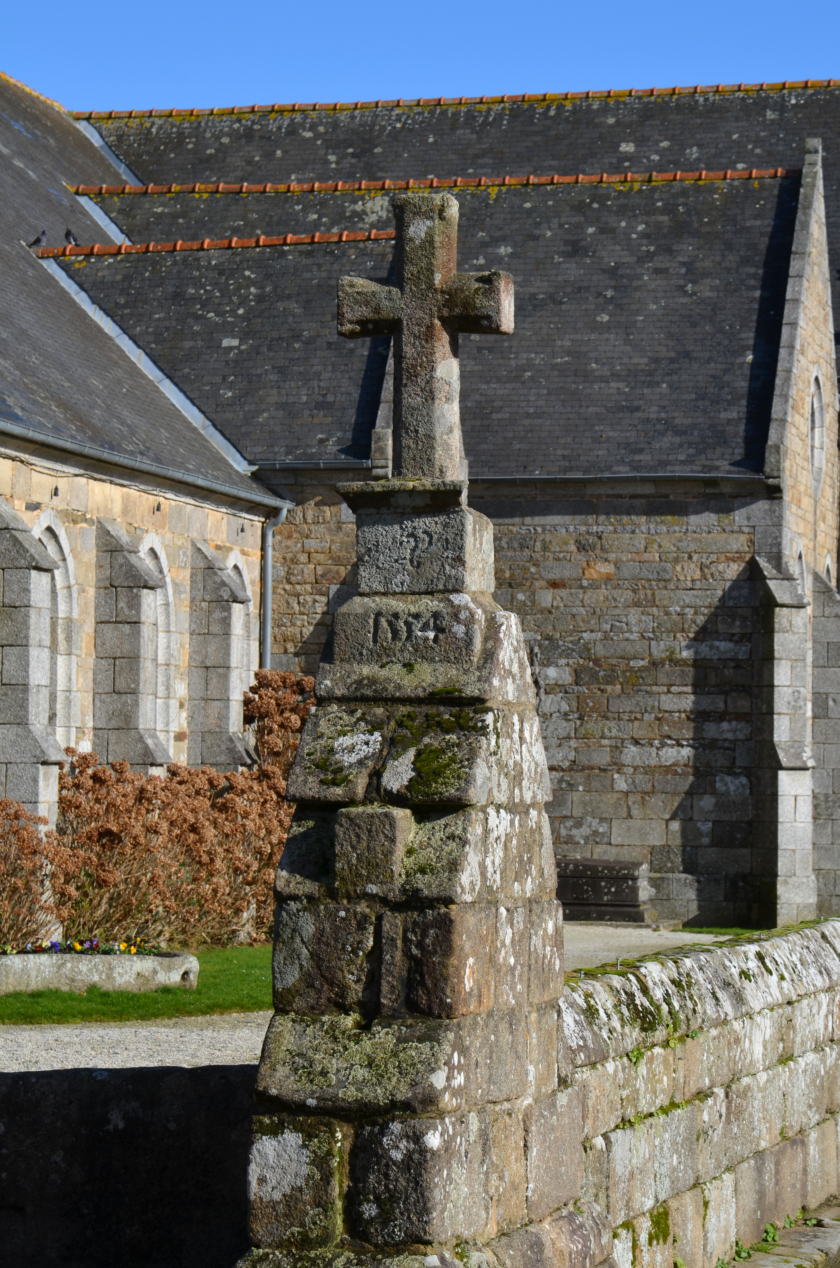 Ploubezre, le bourg : cimetière de l'église paroissiale Saint-Pierre, entrée ouest, détail du pilier sud surmonté d'une croix. On peut lire le millésime "1554"Immatriculation