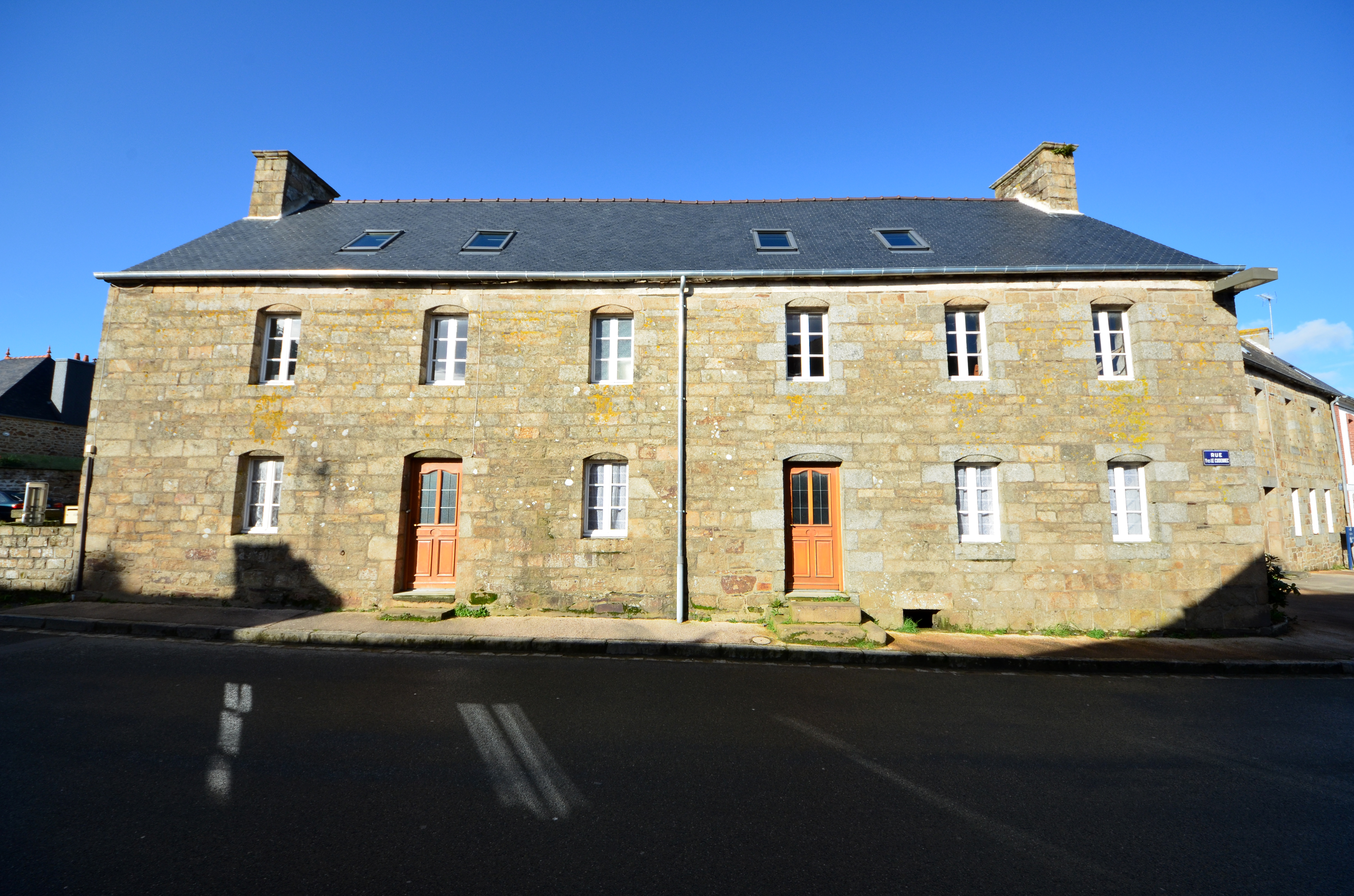 Ploubezre, le bourg, extrémité orientale de la rue Yves Le Cudénnec faisant face à l'église : maison de bourg, élévation antérieure côté rue. Elle est datable du 1er quart du 19e siècle (inscriptions non lisibles)Immatriculation