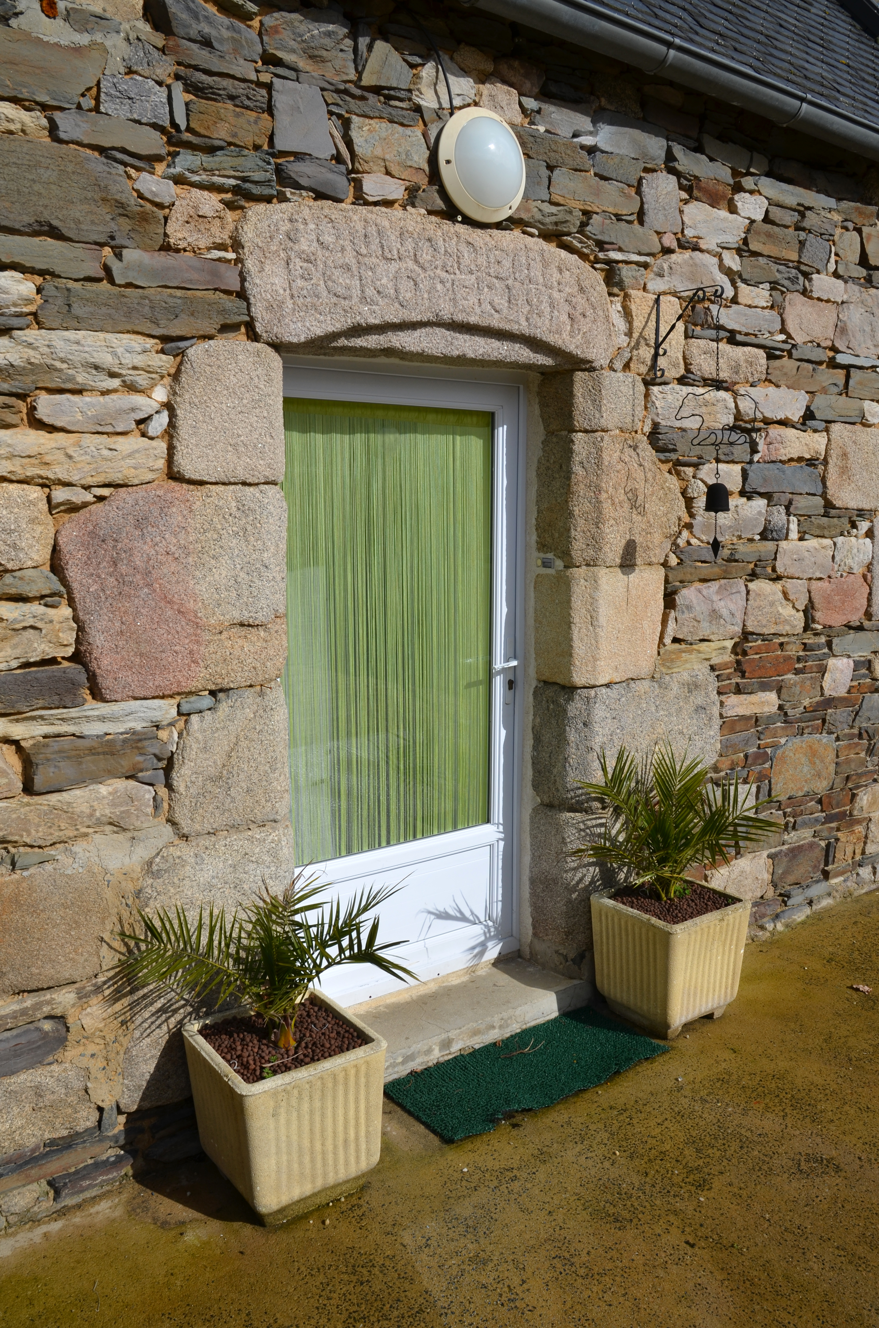 Ploubezre, écart de Keriel : ferme, vue de détail du linteau de la porte portant une inscription et un millésime ": ANTOINE [?] / EC ROPER 1817"Immatriculation
