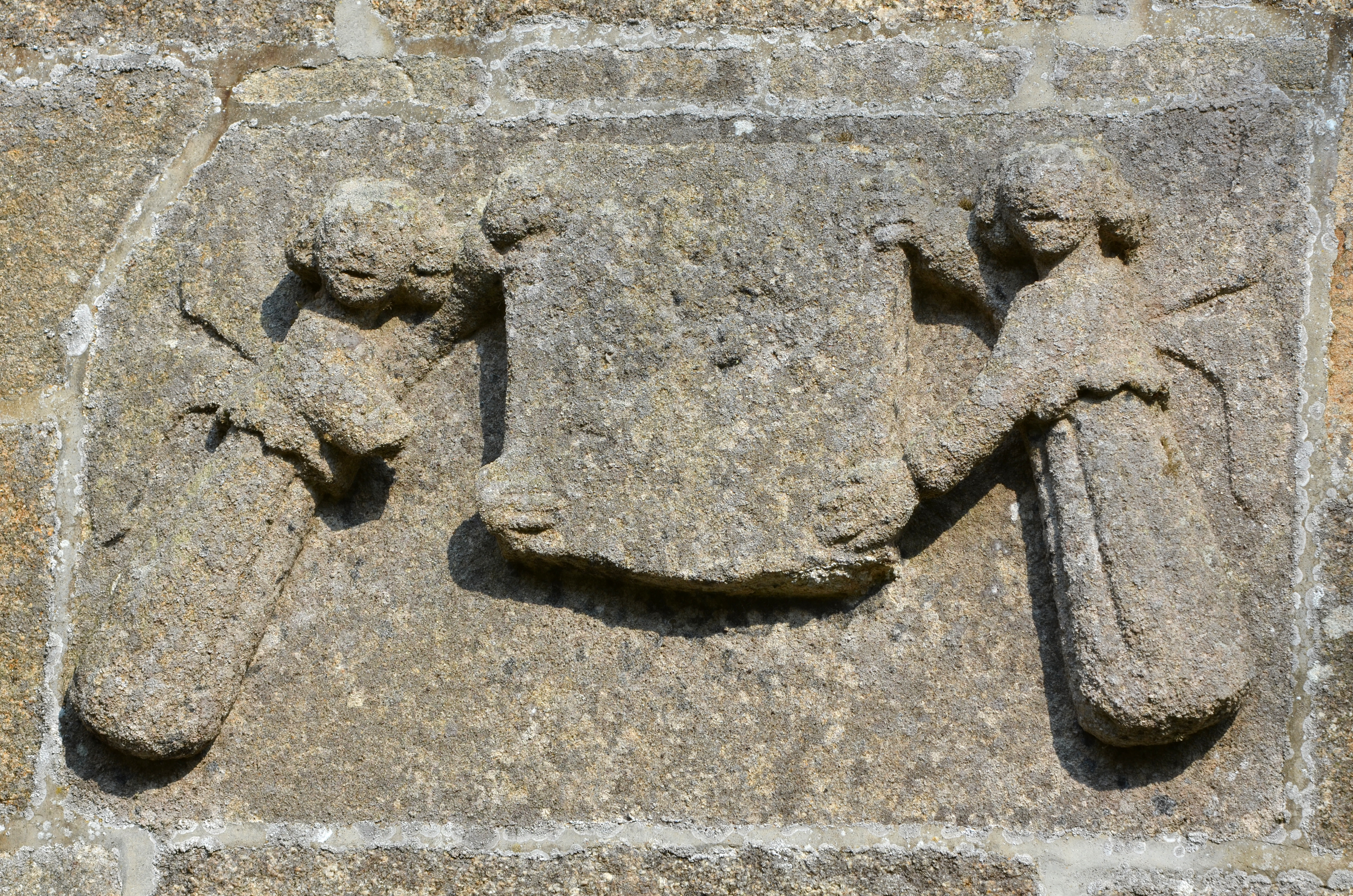 Ploubezre, Runfao : chapelle Saint-Fiacre, armoiries encadrées d'anges surmontant la porte ouest de la chapelle funéraireImmatriculation