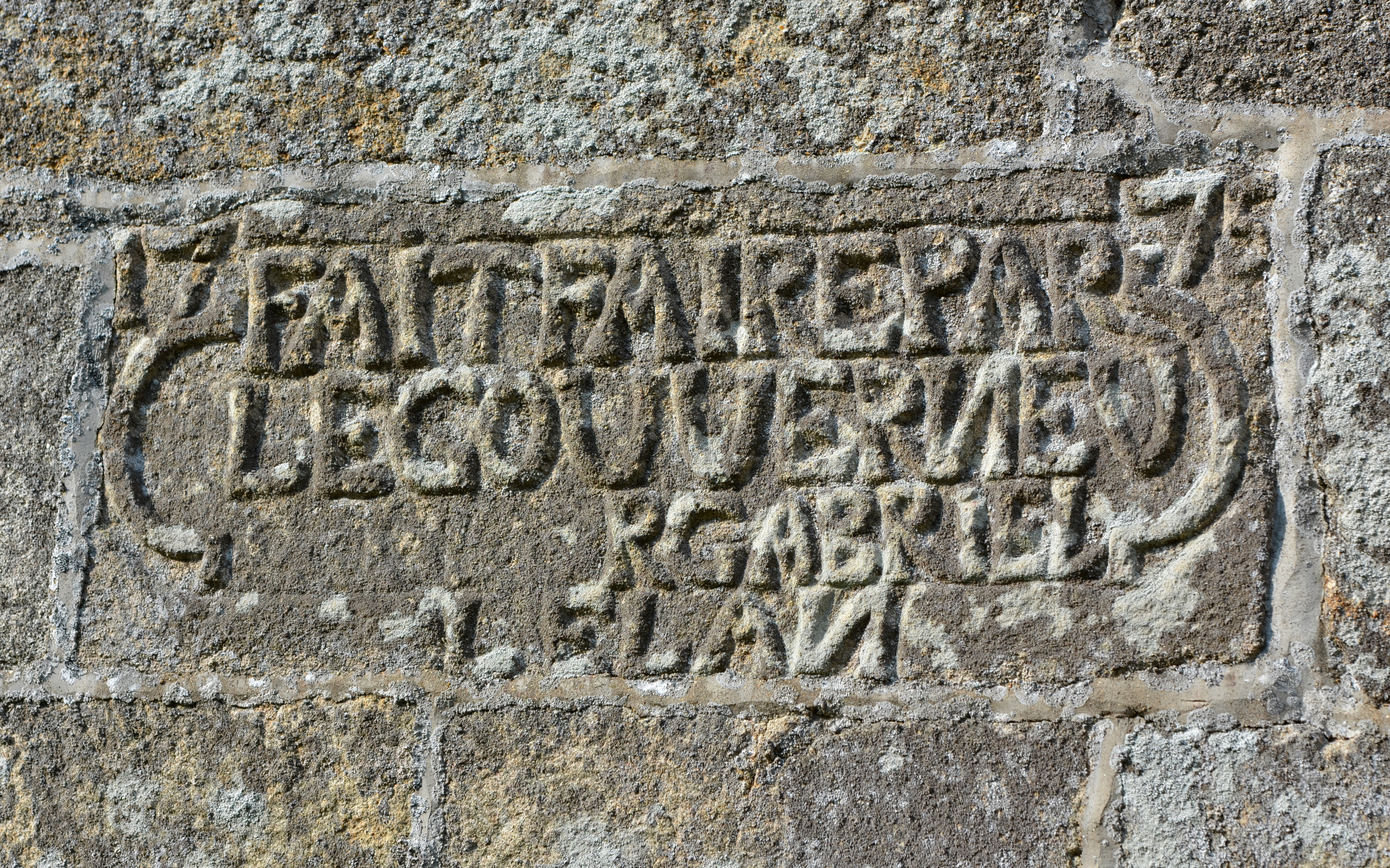 Ploubezre, Runfao : chapelle Saint-Fiacre, détail du mur sud. Il porte le millésime et l'inscription suivante : "17/75 / FAIT FAIRE PA/R LE GOUVERNEU/R GABRIEL/LE LAN"Immatriculation
