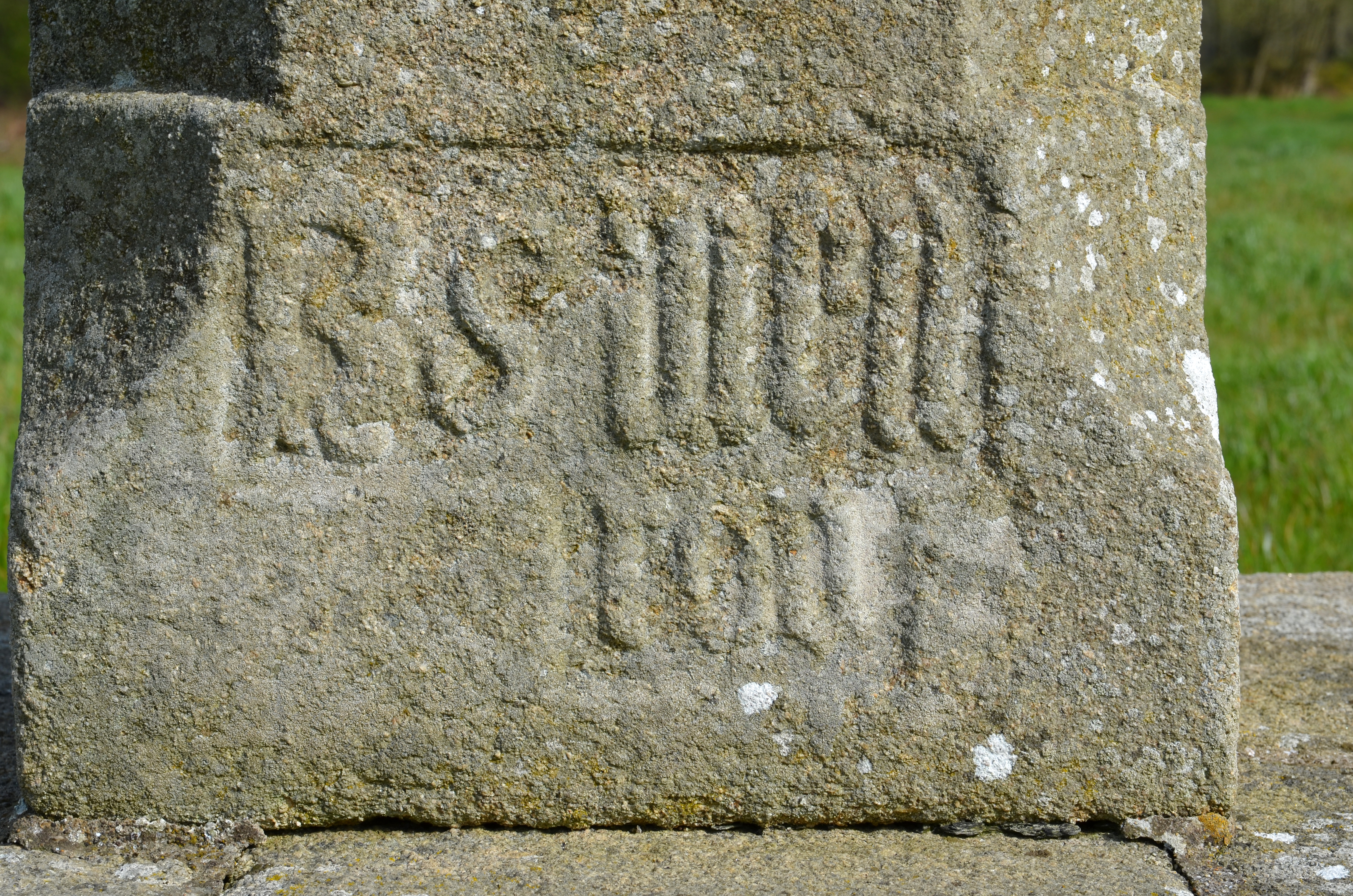 Ploubezre, Kernévez : croix de chemin de la Ville Neuve, détail de l'inscriptionImmatriculation