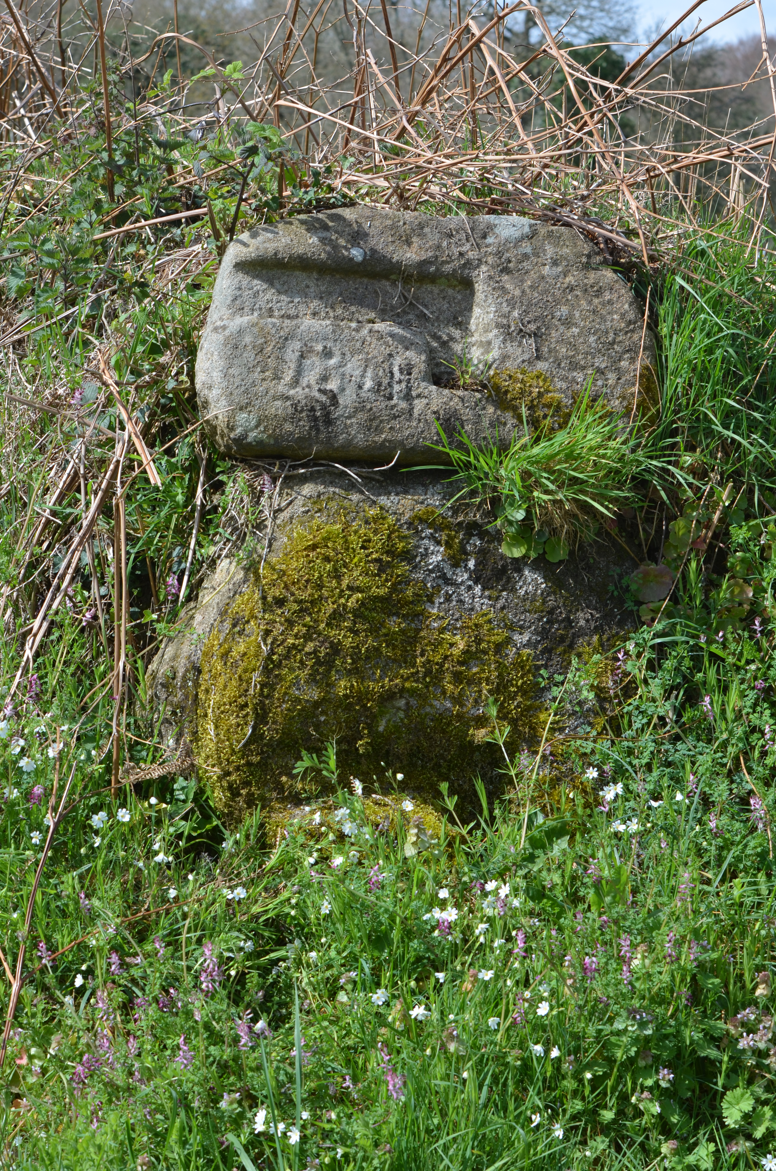 Ploubezre, Keraël : borne en pierre de granite d'entrée de champs ; elle porte le millésime 1841 (?)Immatriculation