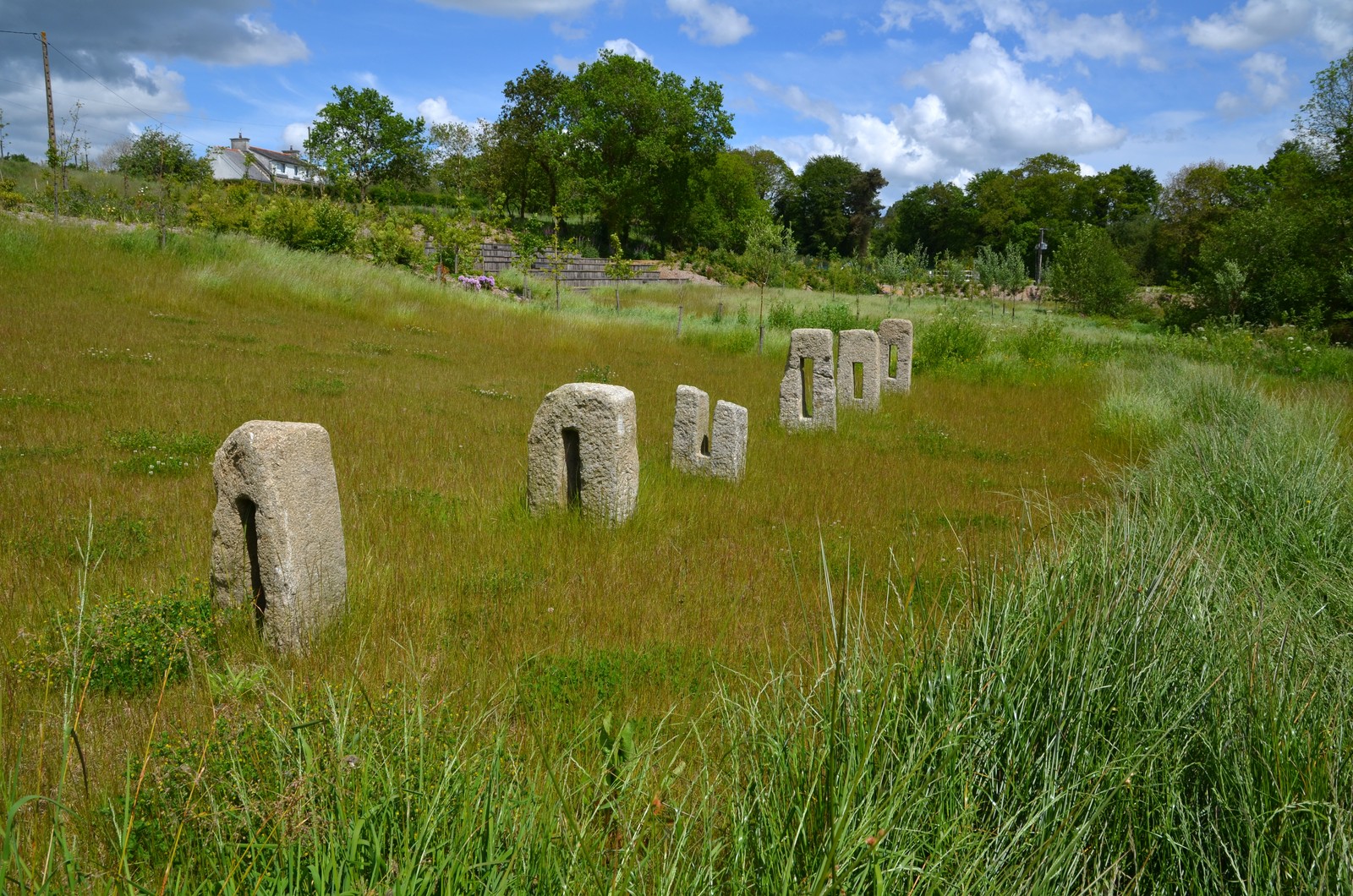 Prat : site du moulin à eau de Poulloguer, détail des pierres percées provenant du système de poutre-frein. L'aménagement du site a été réalisé en 2014Immatriculation