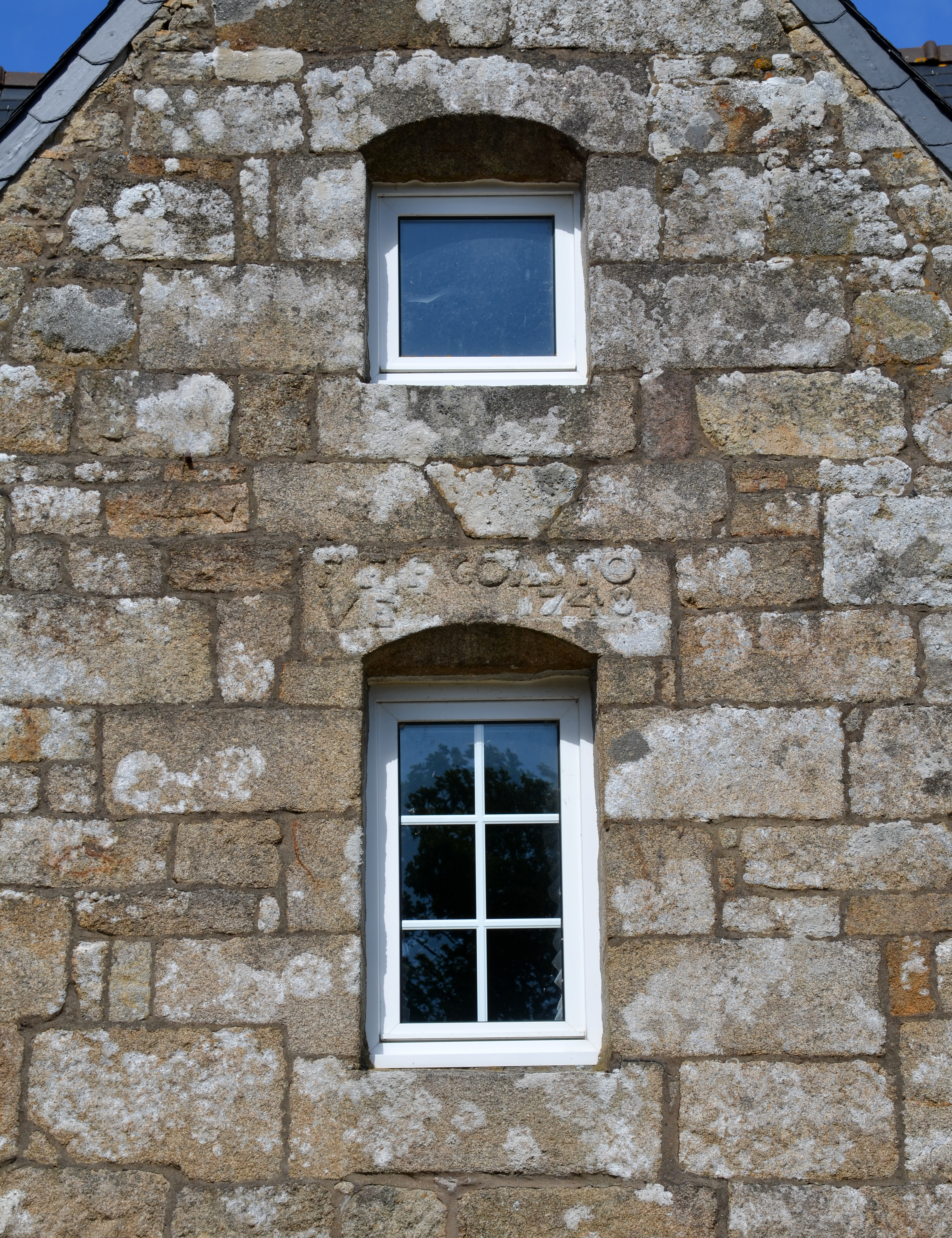 Ploubezre, Convenant Le Lamer : logis de ferme et puits, détail de l'avancée. On peut lire : "F.F.E. GOASTO VE [GOASDOUE] 1748"Immatriculation