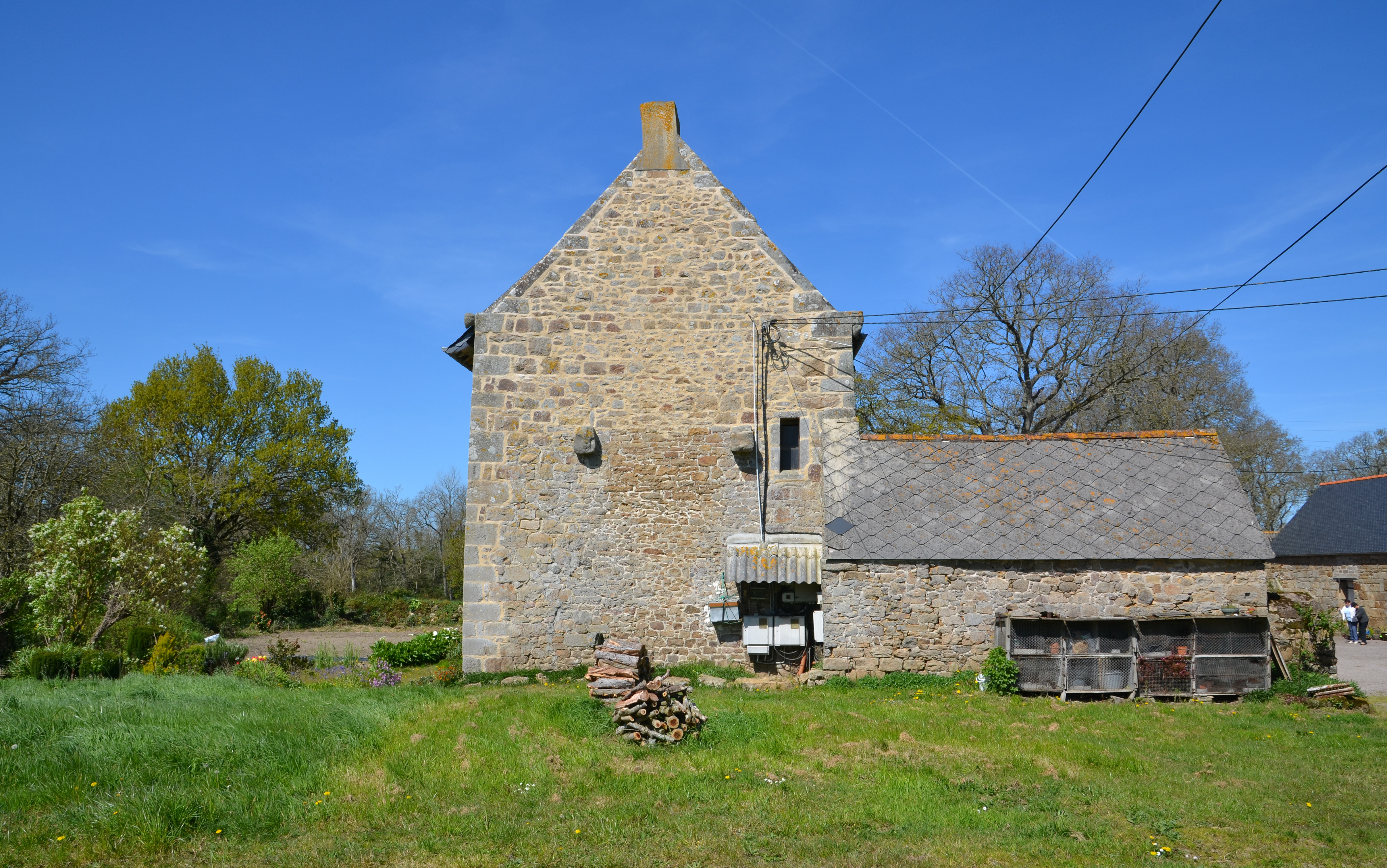 Ploubezre, Le Launay : manoir, pignon sud ; le logis est accosté d'une remise construite au 19e siècle. Les corbeaux de la cheminée de la salle haute traverse le mur ; à signaler, la petite baie éclairant la salle le midiImmatriculation